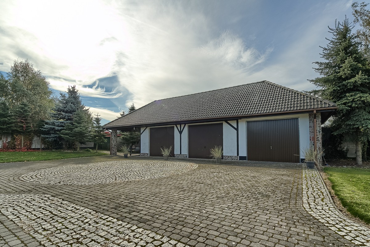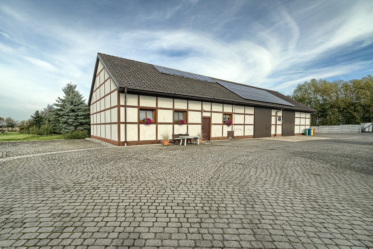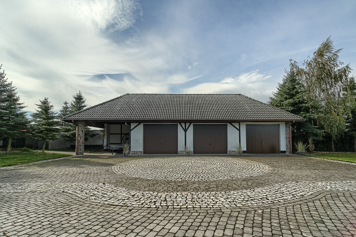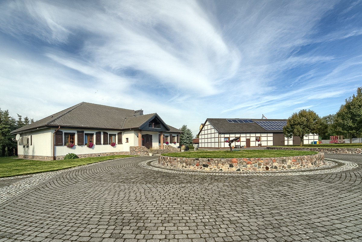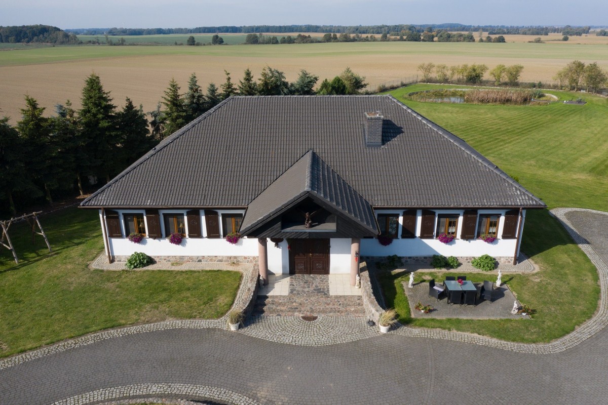 Wszystkie budynki gospodarcze pokryte dachówką cementową Braas. Budynek mieszkalny pokryty dachówką ceramiczną Braas.