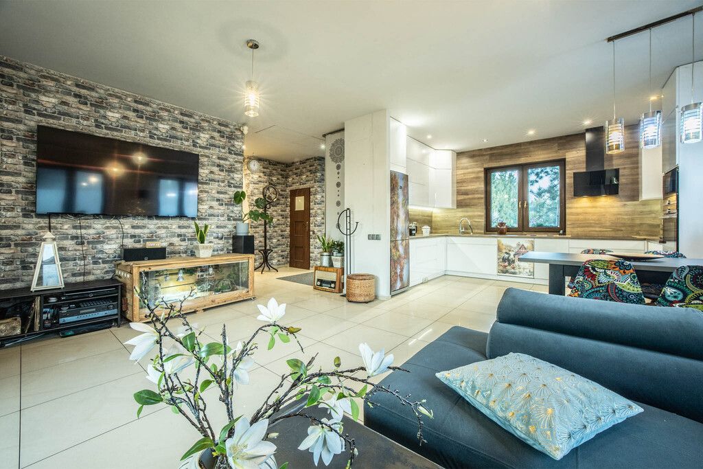 Dom oferuje przestronną strefę dzienną, która sprzyja wspólnemu spędzaniu czasu oraz wygodną część prywatną zapewniającą domownikom komfort i intymność.