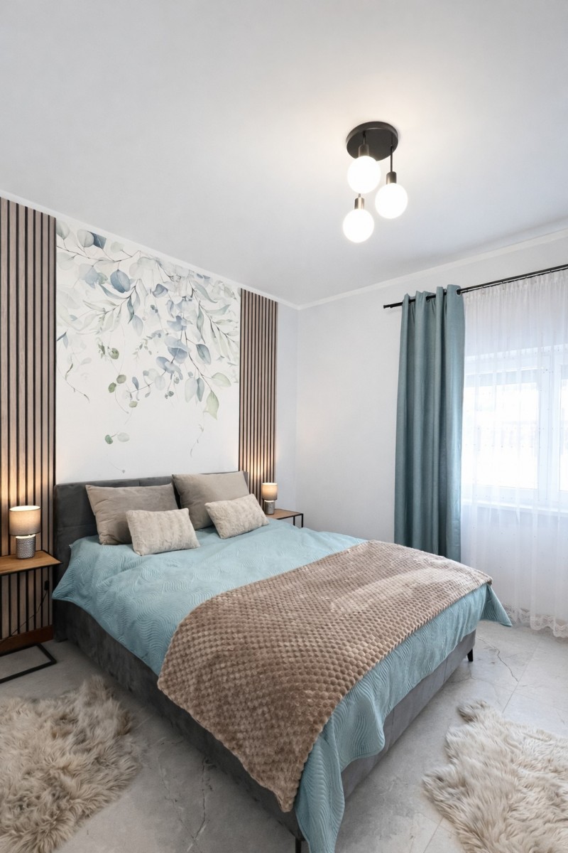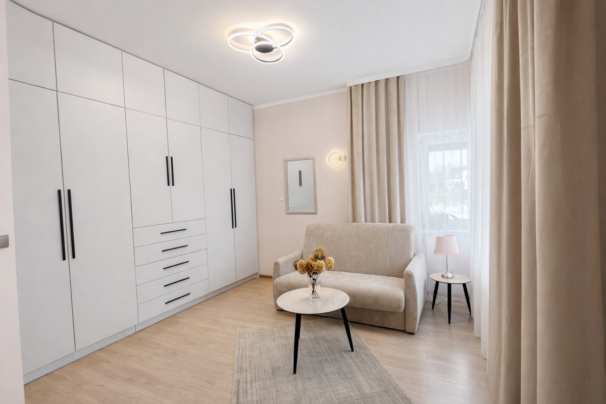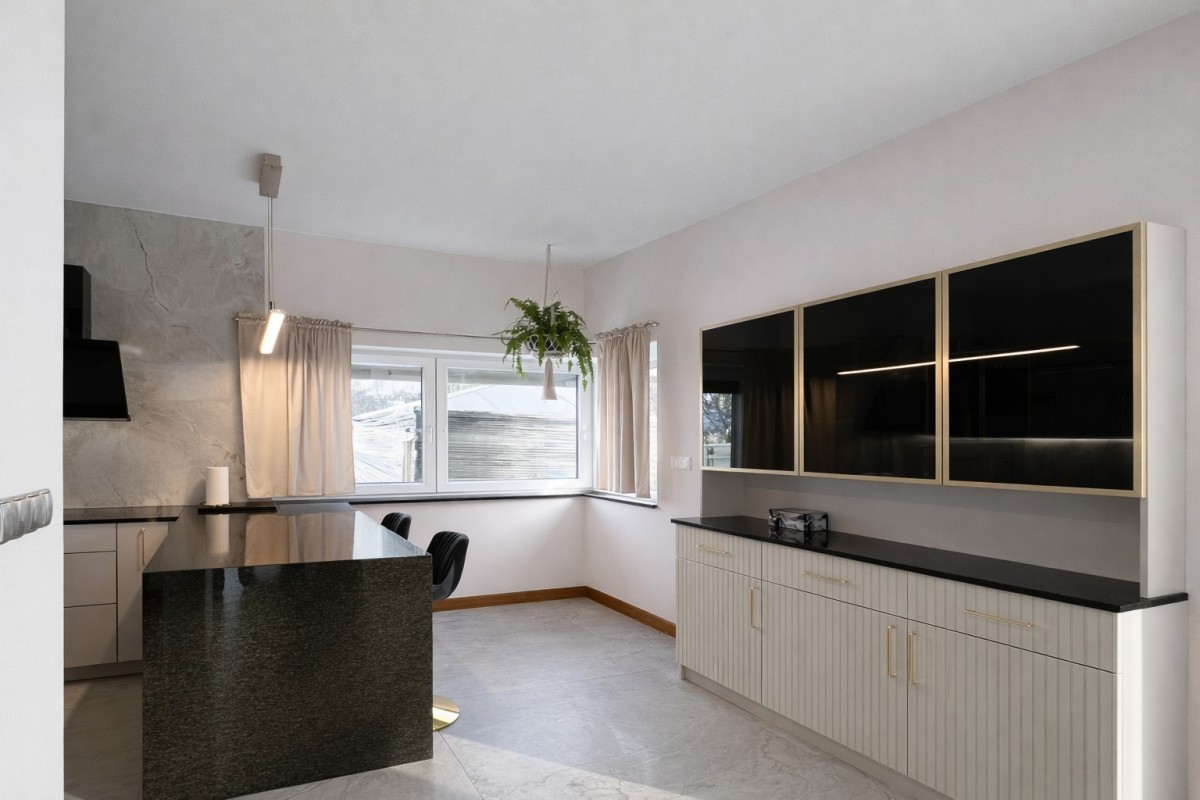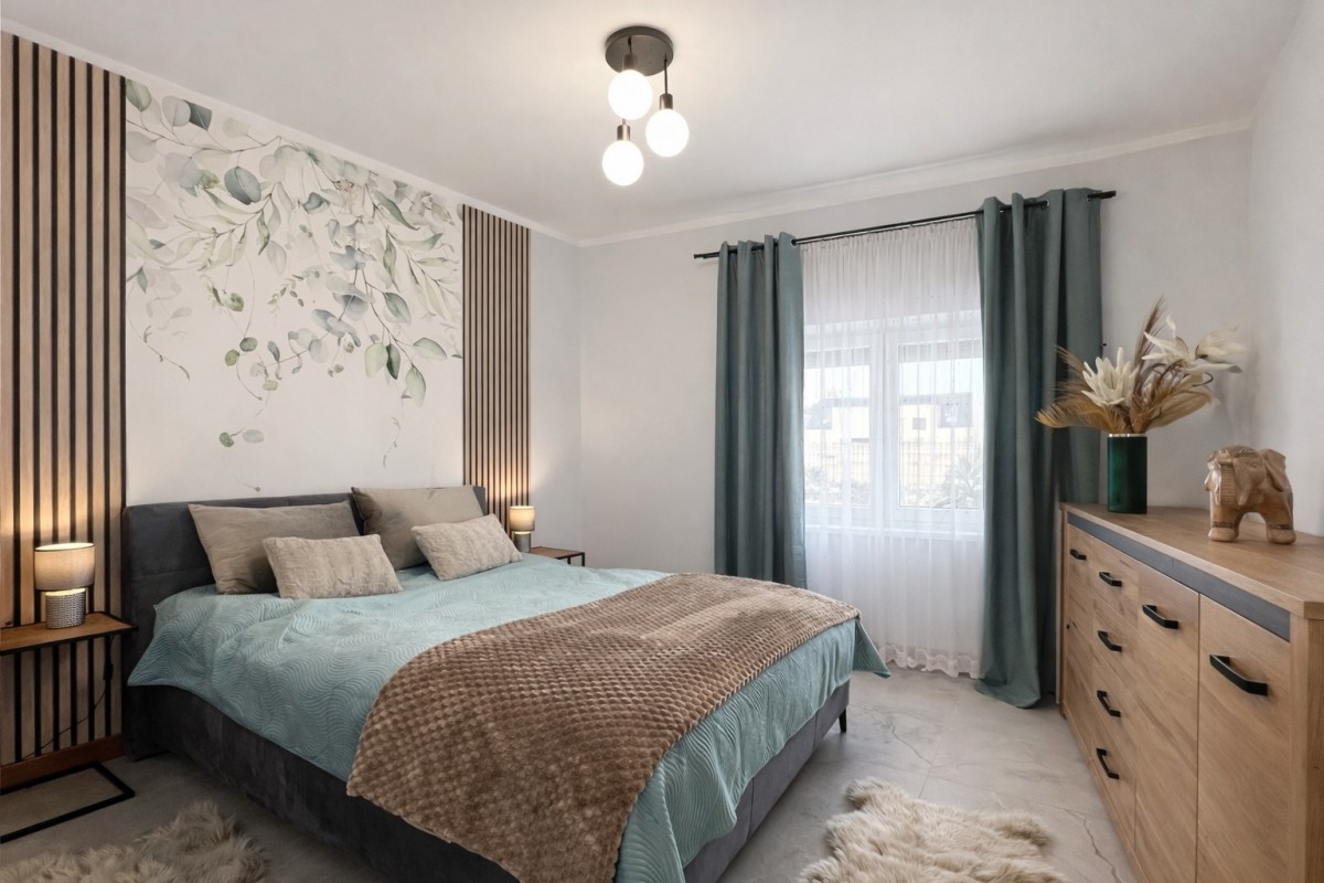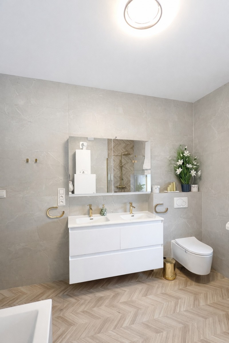 Wnętrze dopełnia jednolita stolarka drewniana - drzwi, ościeżnice oraz listwy przypodłogowe wykonane w tej samej stylistyce, podkreślające konsekwencję wykończenia i jakość zastosowanych materiałów.