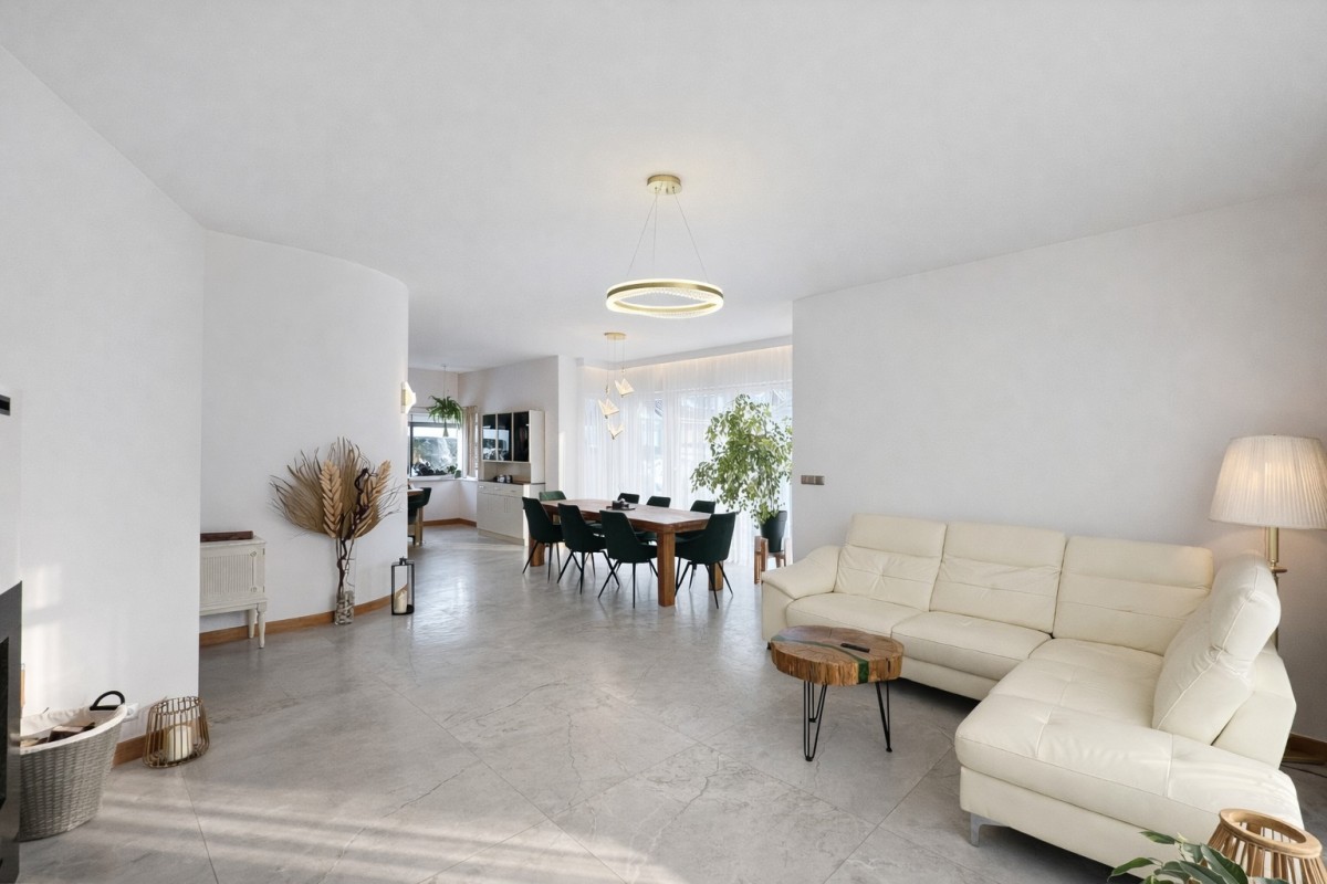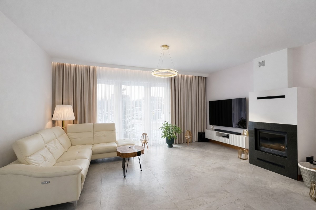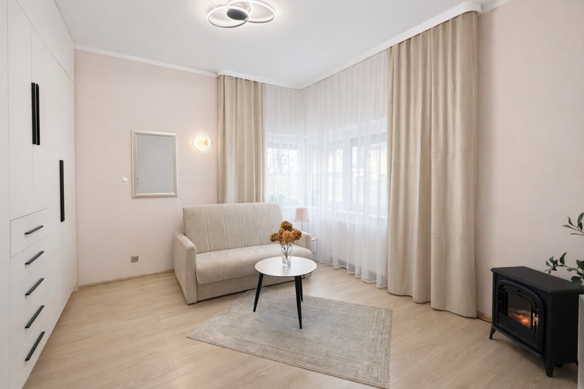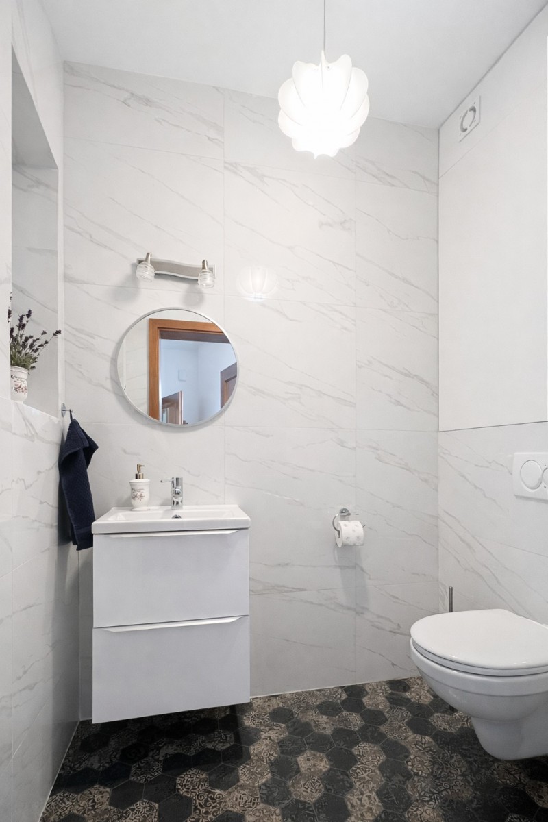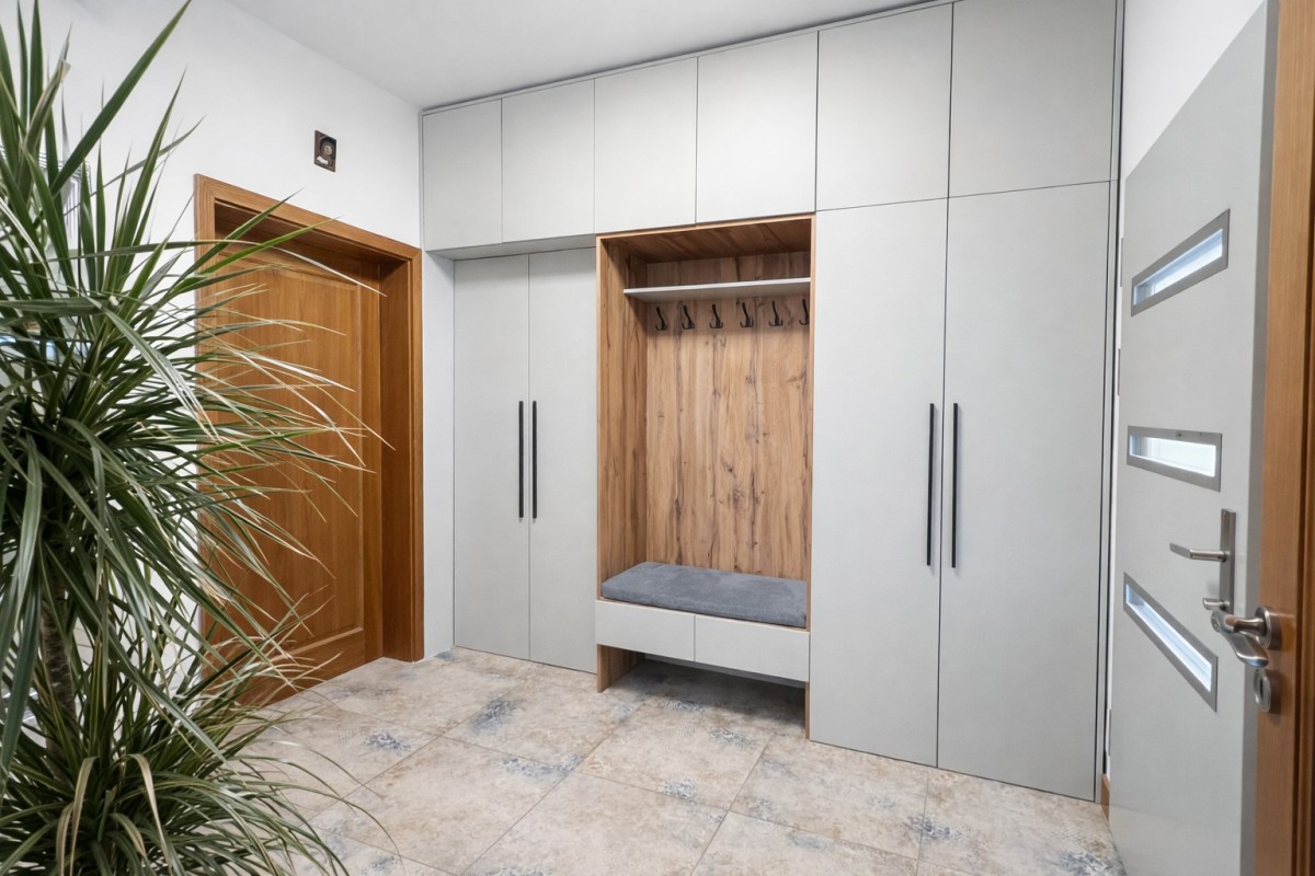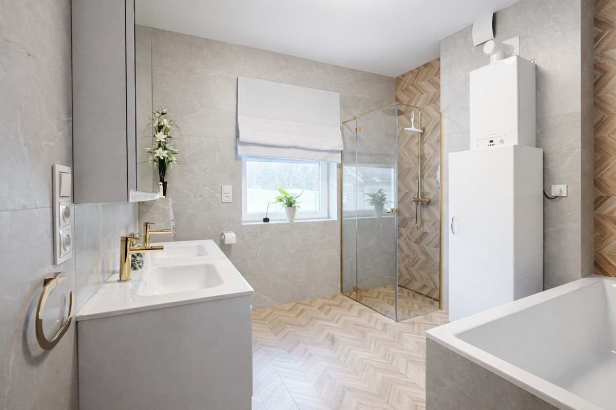 Wnętrze dopełnia jednolita stolarka drewniana - drzwi, ościeżnice oraz listwy przypodłogowe wykonane w tej samej stylistyce, podkreślające konsekwencję wykończenia i jakość zastosowanych materiałów.