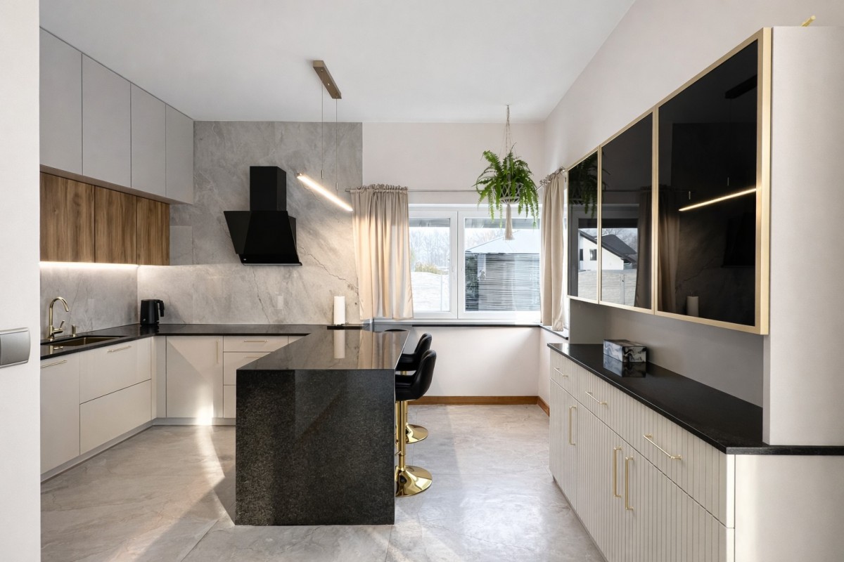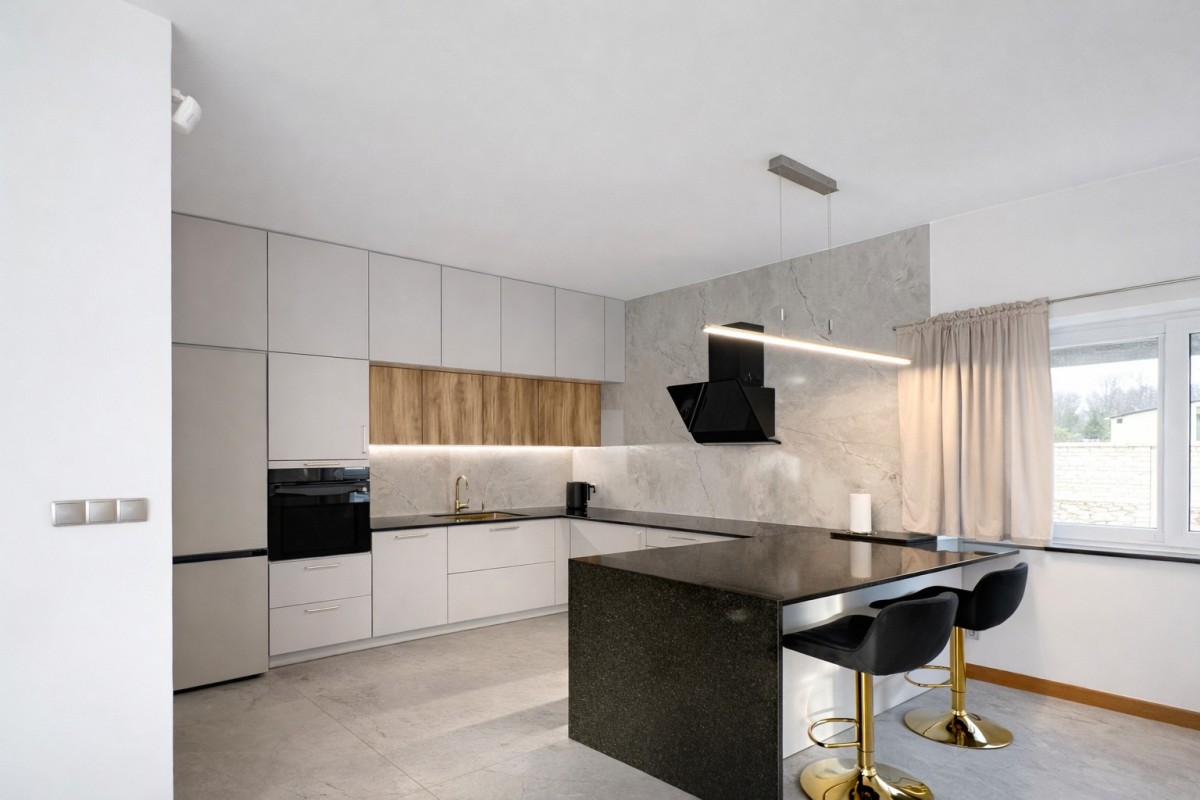 - sprzęt AGD: płyta indukcyjna, piekarnik parowy, lodówko‑zamrażarka, zmywarka, okap