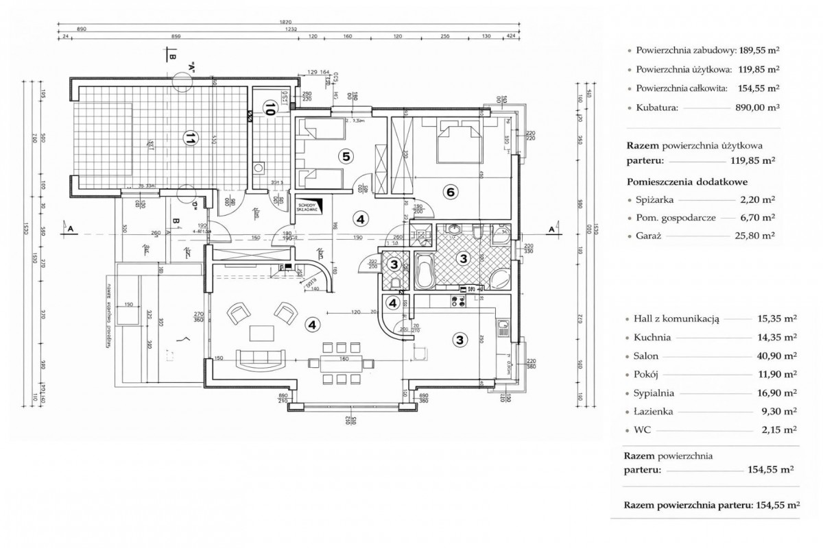 - Powierzchnia domu: 119,85 m² użytkowa (pow. całkowita: 154,55m2, w tym: spiżarka 2,20m2+ pom. gosp. 6,70m2 + garaż 25,80m2)