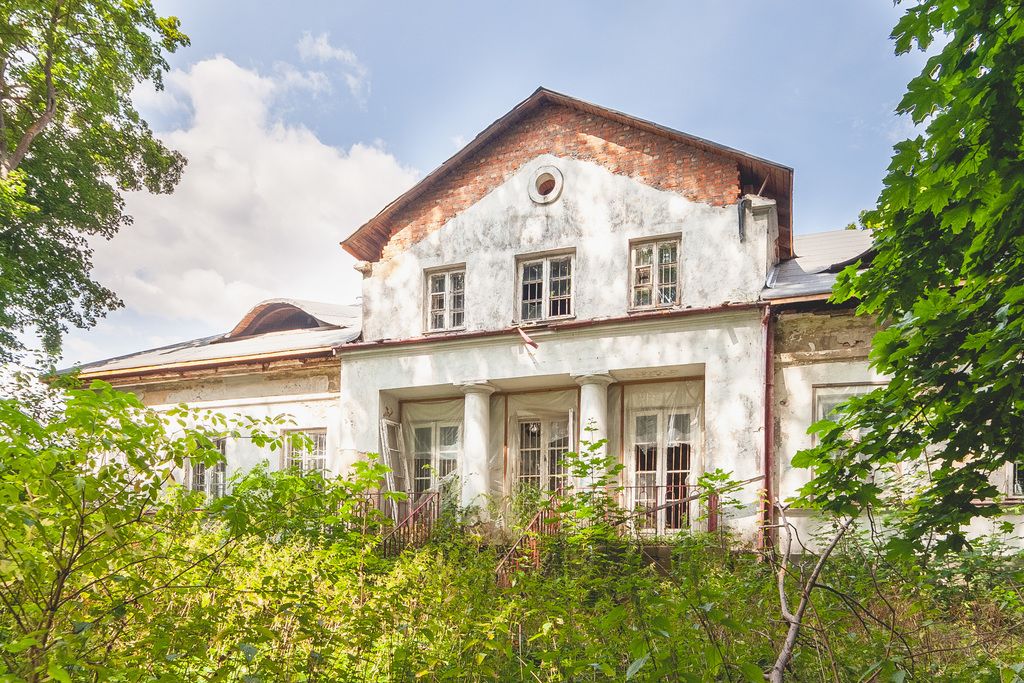 The manor house is a single-story structure, built of brick and plastered, with a regular rectangular plan and a residential attic. The entire structure has a basement and is covered with a hipped sheet metal roof. The front elevation has nine window axes, with a central projection containing a two-column, Doric, recessed portico supporting a terrace in front of the first-floor extension. The extension is topped with a triangular gable with a decorative oculus. The rear elevation features a portico similar to the front one, but in the Tuscan order. The interior layout is two-bay, with a corridor separating the bays, and with hallways and a living room on the axis. The entire structure is maintained in the spirit of Classicism.