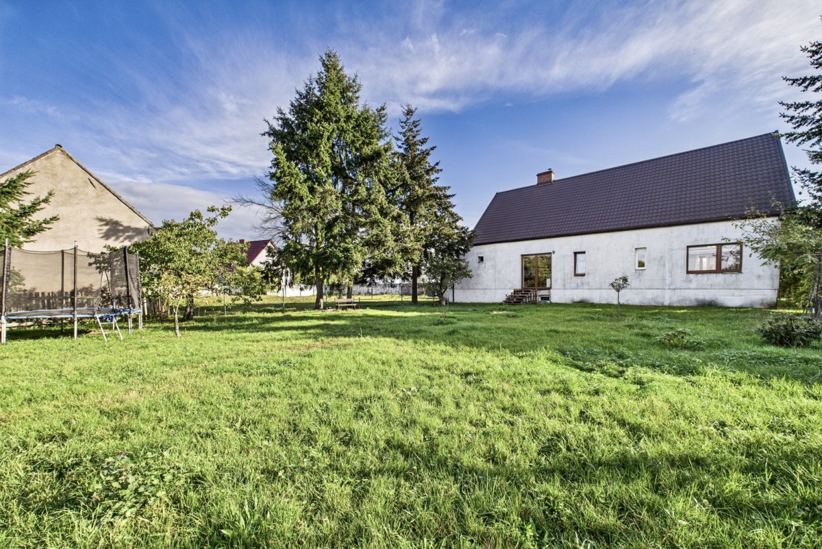 Dom usytuowany jest na dużej, płaskiej działce o powierzchni 2548 m² (nr 68/3), ogrodzonej i wyposażonej w oświetlenie z czujnikami ruchu. Na parterze domu znajduje się funkcjonalny układ pomieszczeń: