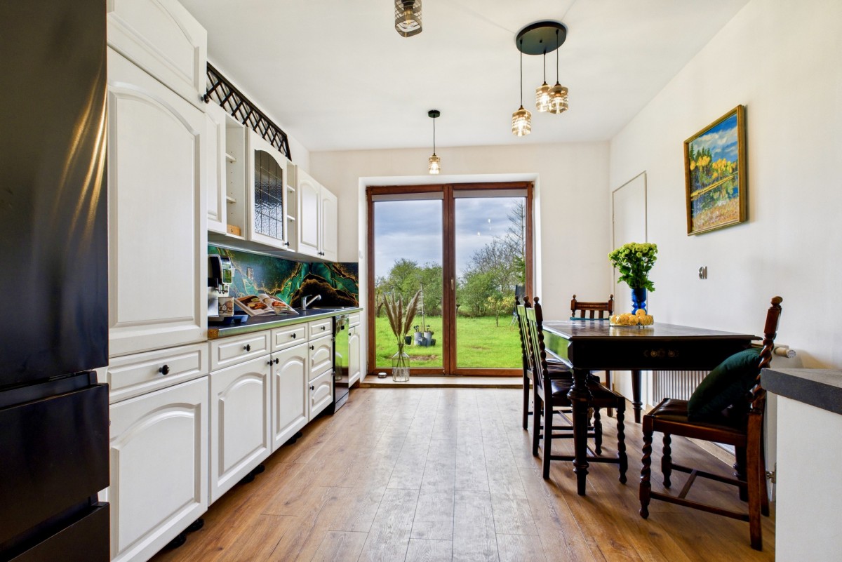 - duża kuchnia z bezsłupkowym oknem balkonowym prowadzącym na ogród
