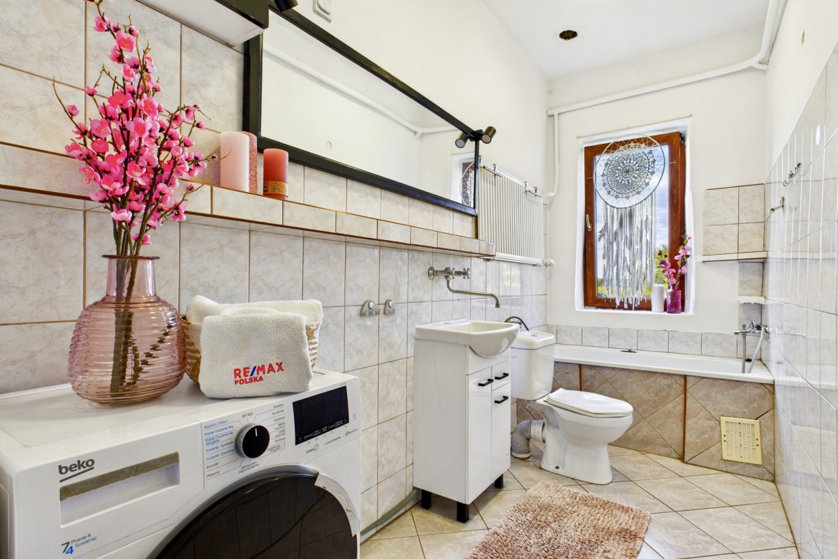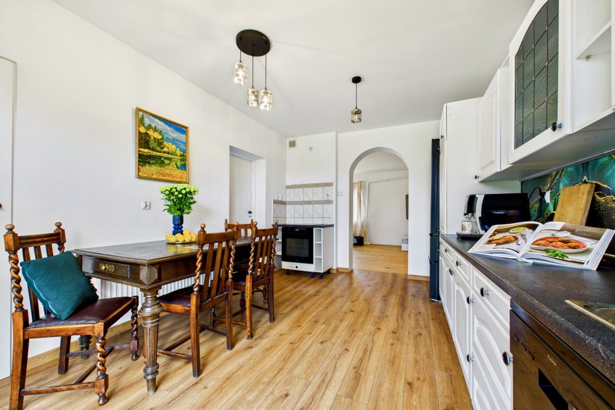 Na terenie posesji znajdują się również budynki gospodarcze, garaż dwustanowiskowy z kanałem oraz kuchnia letnia. Dom pochodzi z 1903 roku i zachował wiele ze swojego pierwotnego uroku, w tym oryginalne drzwi wejściowe, które można odrestaurować, przywracając im dawny charakter. Budynek wzniesiono z cegły, jest częściowo podpiwniczony i przeszedł szereg prac modernizacyjnych. Wykonano termoizolację fundamentów (tzw. podcinkę), a dach pokryto blachodachówką. Poddasze zostało ocieplone pianą PUR o grubości 26 cm. Właściciel nieruchomości skorzystał z dofinansowania, w ramach programu Czyste Powietrze, dzięki któremu wykonano kompleksowe prace modernizacyjne tj: