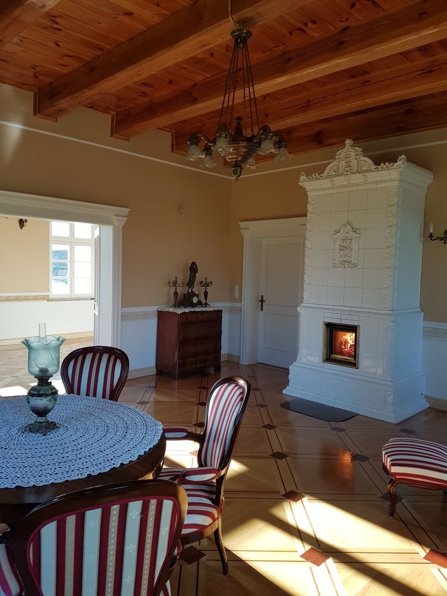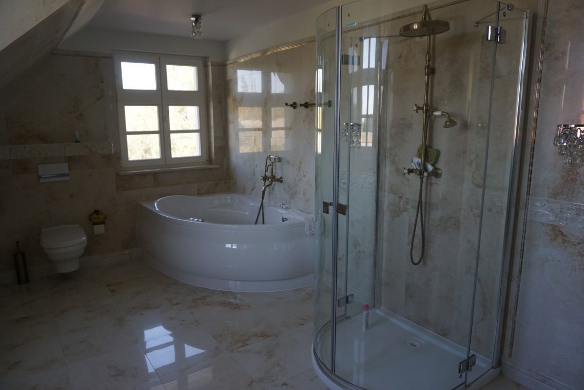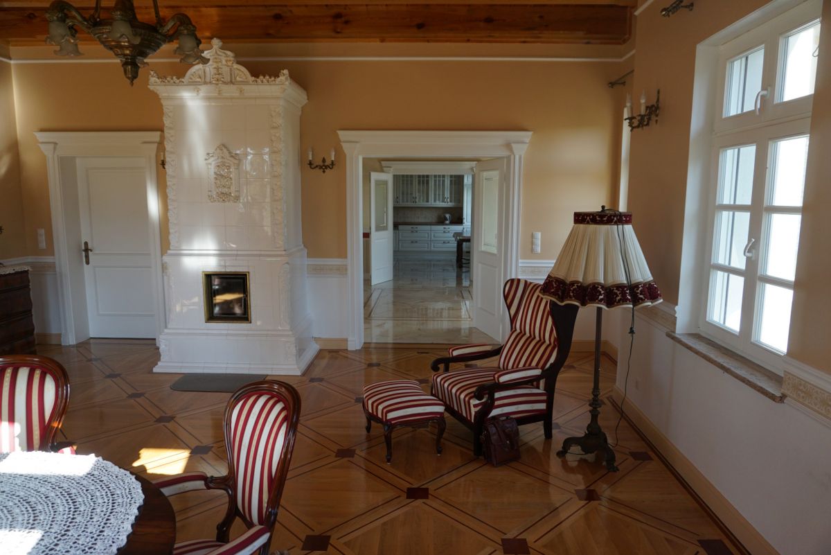 Centralnym punktem strefy dziennej jest przestronny salon z kominkiem, który tworzy przytulną atmosferę i sprzyja wypoczynkowi. Duża, funkcjonalna kuchnia stanowi wygodną przestrzeń do codziennego użytkowania, a komfortowe łazienki podnoszą standard nieruchomości.