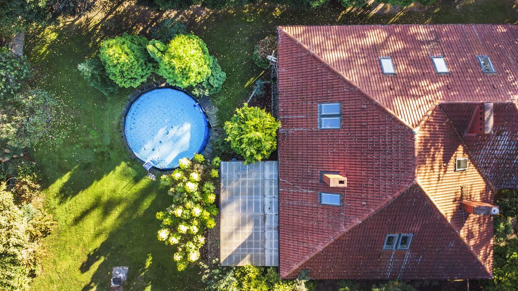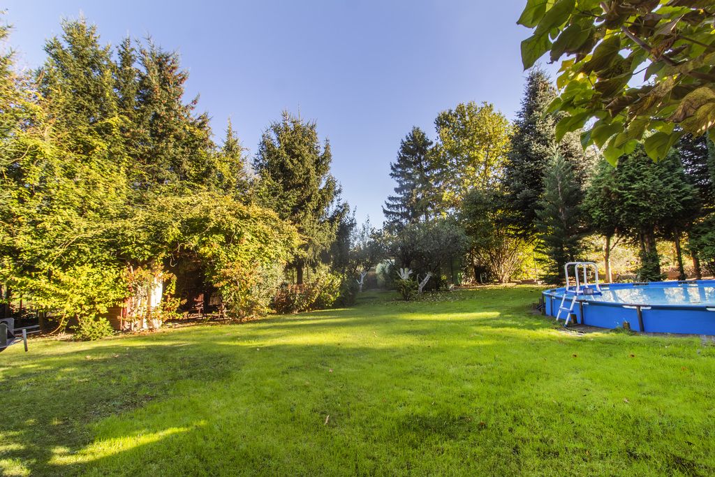 Udogodnienia na działce: basen wkopany w ziemię, altana, składzik na narzędzia, oczko wodne, liczne krzewy i drzewa owocowe.