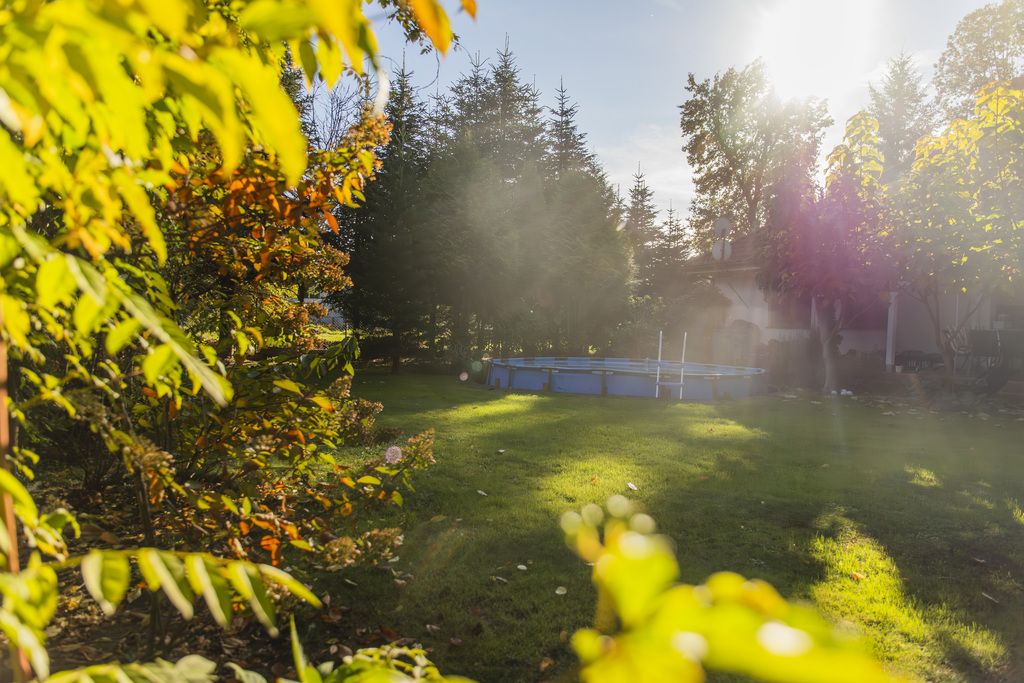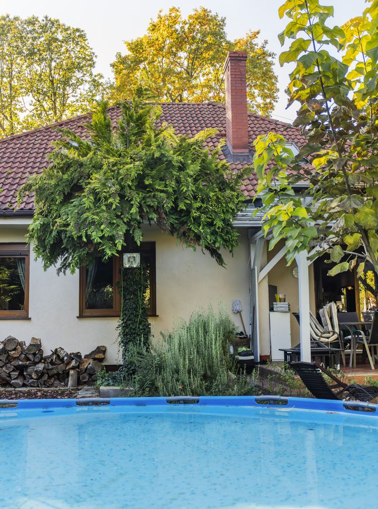 Działka została starannie zagospodarowana i zachwyca bogactwem zieleni, licznymi nasadzeniami oraz miejscem do odpoczynku. W ogrodzie znajduje się basen rozporowy, umieszczony w specjalnie przygotowanym zagłębieniu wyłożonym belami – rozwiązanie zarówno estetyczne, jak i praktyczne. Koło basenu mogą Państwo zobaczyć swoistego rodzaju "palmę" zrobioną z drzewa iglastego :) Relaks w basenie pod palmami to coś, na co Państwo zasługują! Na ogrodzie znajduje się też składzik gospodarczy na narzędzia, altana oraz oczko wodne.