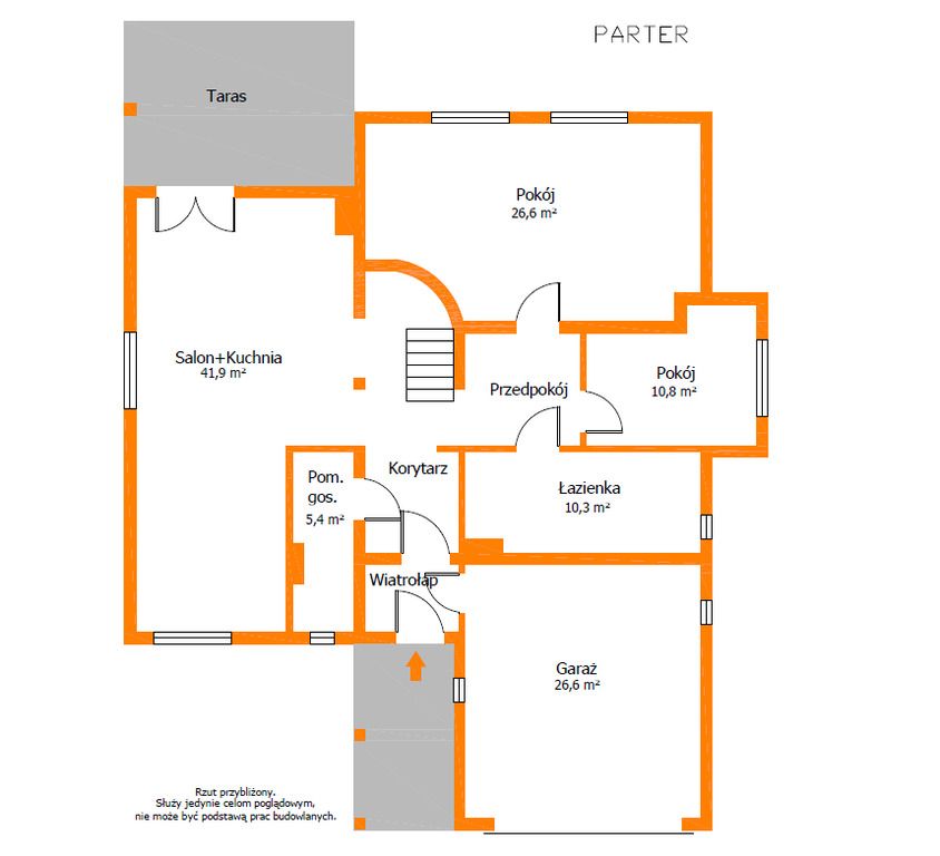 Na parterze znajduje się przestronny salon z jadalnią i wyjściem na taras (41,9 m²), idealny do wspólnego spędzania czasu w gronie bliskich. Centralnym punktem tego pomieszczenia jest kominek, który nie tylko skutecznie ogrzewa wnętrze, ale również tworzy wyjątkowy klimat – sprawiając, że w tym domu jest ciepło nie tylko temperaturowo.
