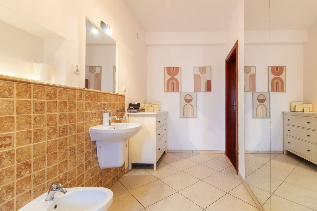Obok mieści się otwarta kuchnia, duża łazienka (10,3 m²) z wanną, dwa pokoje – w tym jeden główny o powierzchni 26,6 m² (służący aktualnie jako biblioteka) oraz drugi mniejszy - sypialniany (10,8 m²), mogący pełnić funkcję gabinetu lub pokoju gościnnego. Dodatkowym atutem jest garaż (26,6 m²) połączony z częścią mieszkalną.