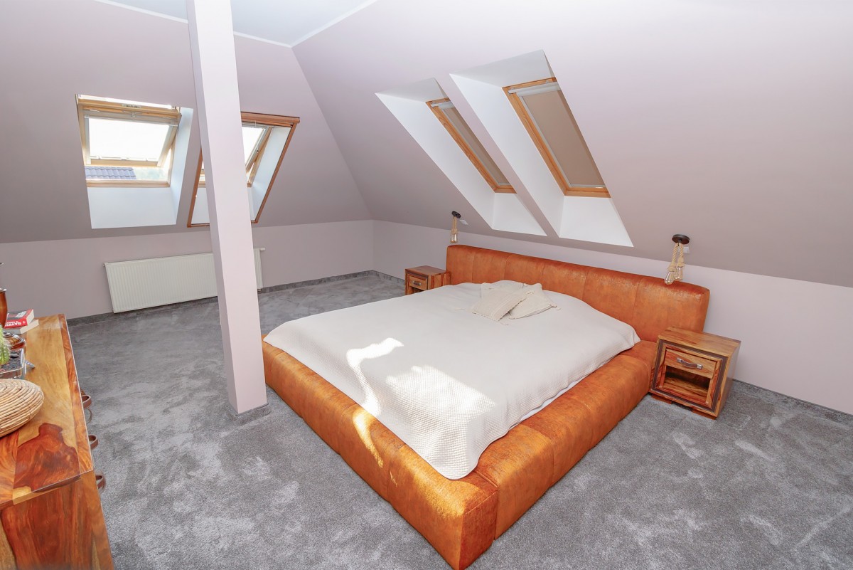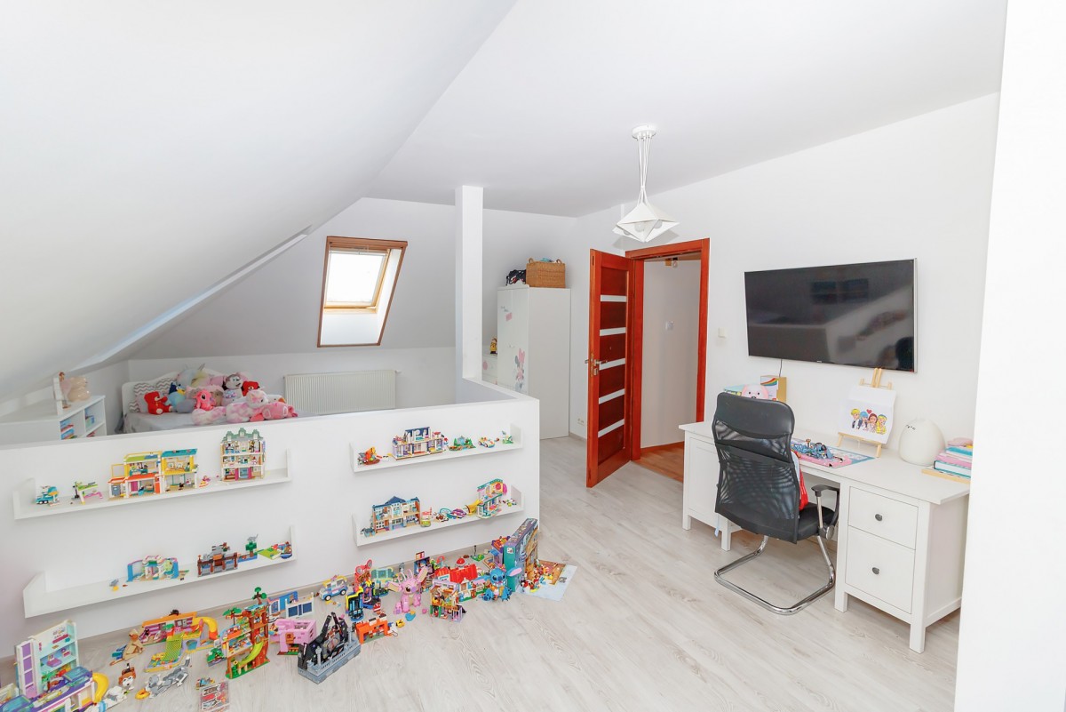 - piętro: trzy przestronne sypialnie, w tym z własną łazienką i garderobą; jedna z nich urządzona jako pokój dziecięcy z miejscem na klocki LEGO i przestrzeń do zabaw. W tym pokoju Twoje dziecko będzie mogło zrobić nocowankę dla wszystkich dzieci z klasy.