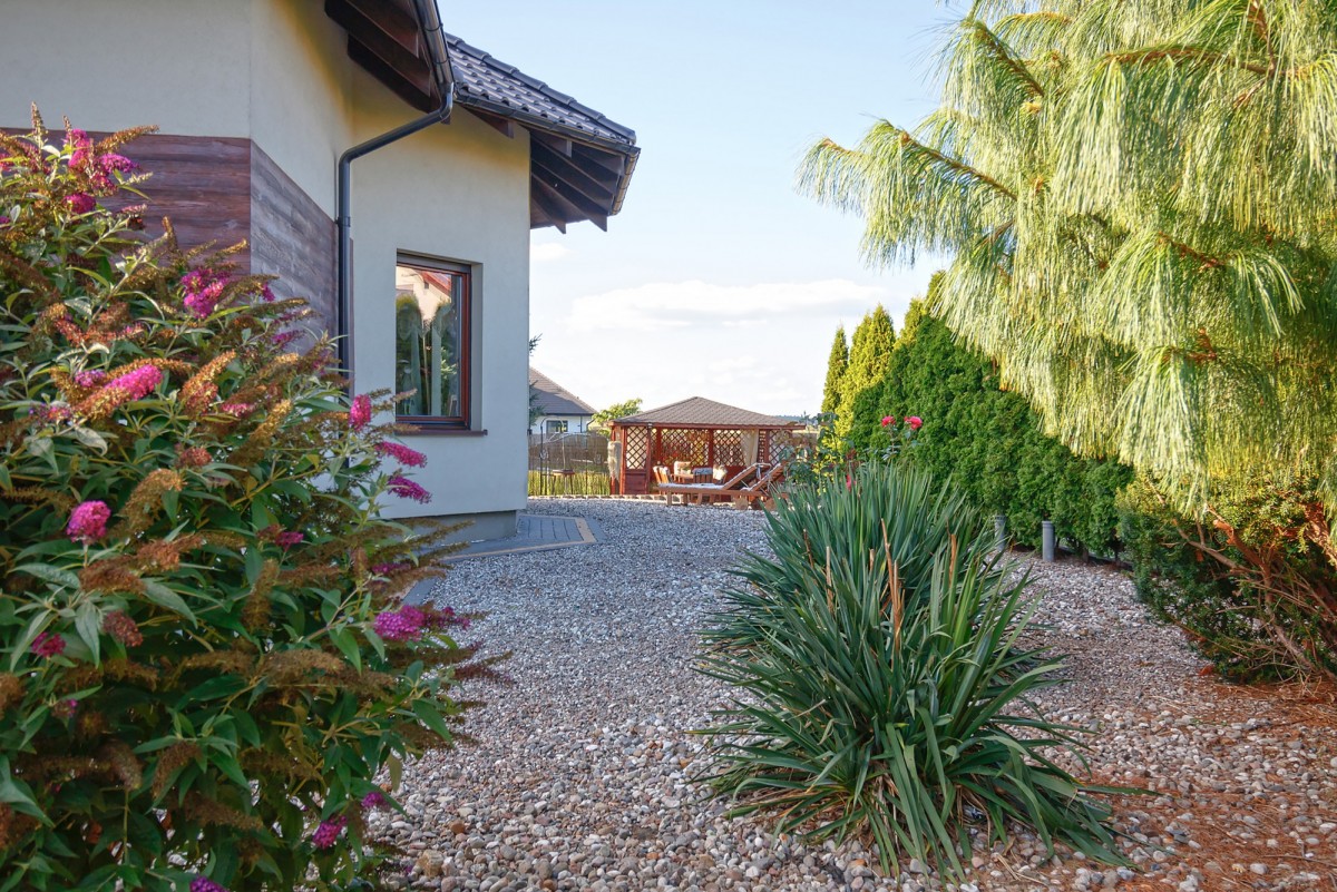 Na zagospodarowanej działce znajduje się taras, altana grilowa oraz wolnostojący garaż w lekkiej konstrukcji, aktualnie pełniący funkcję magazynową.