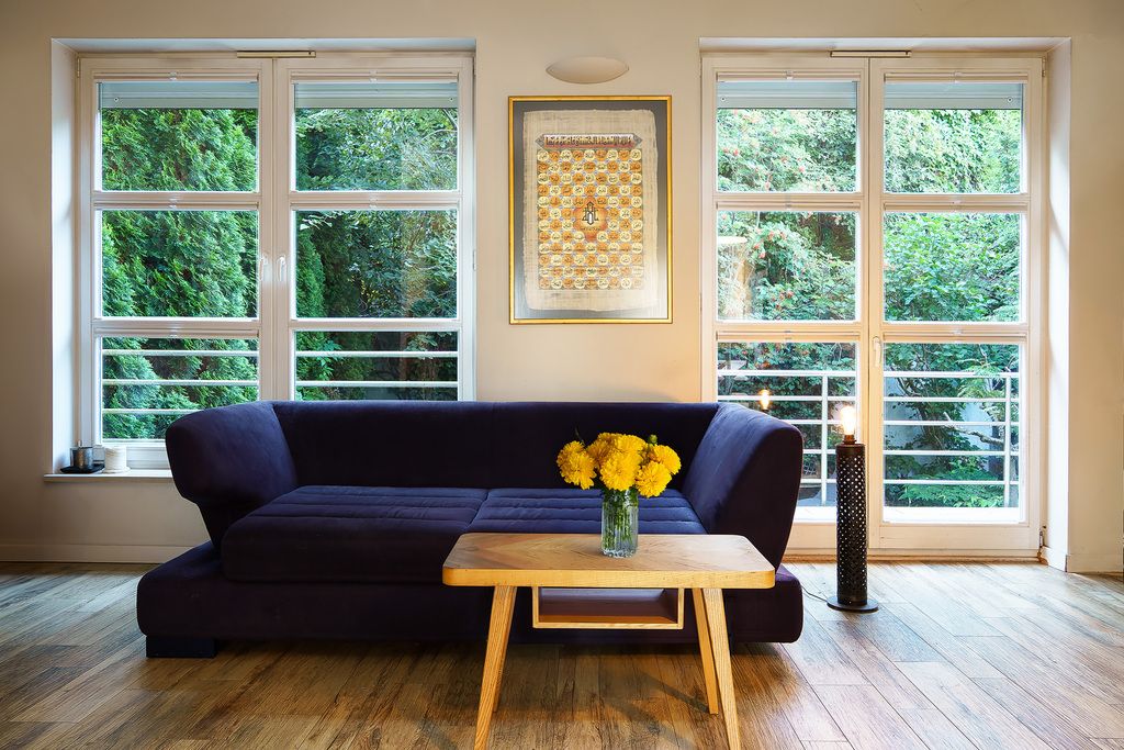 W salonie i kuchni wysokie dwuskrzydłowe okna wprowadzające do wnętrza dużo światła.