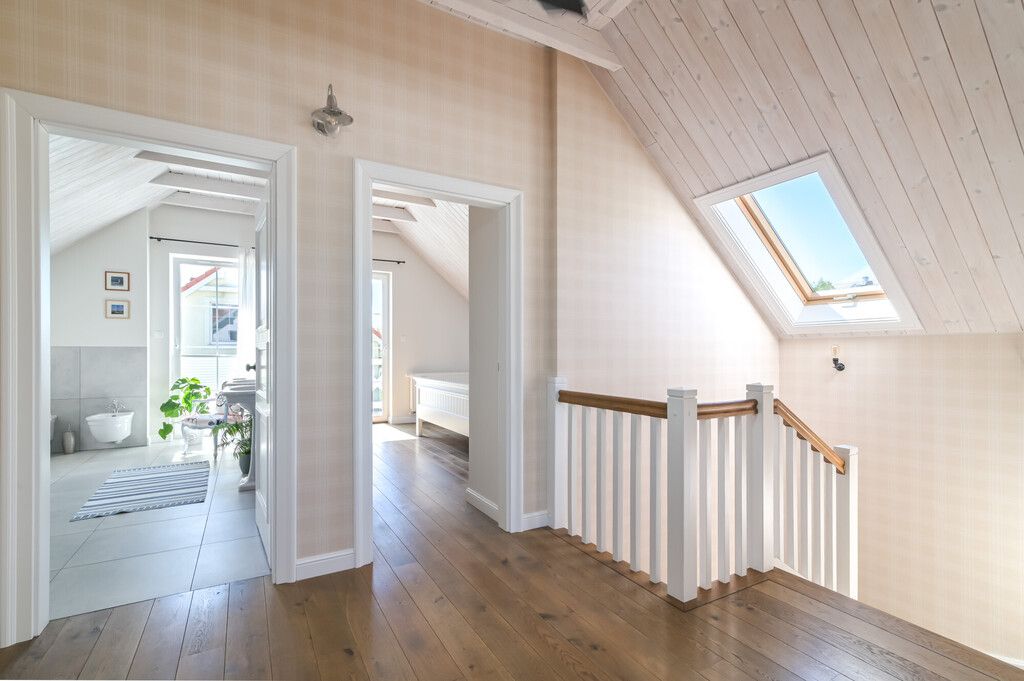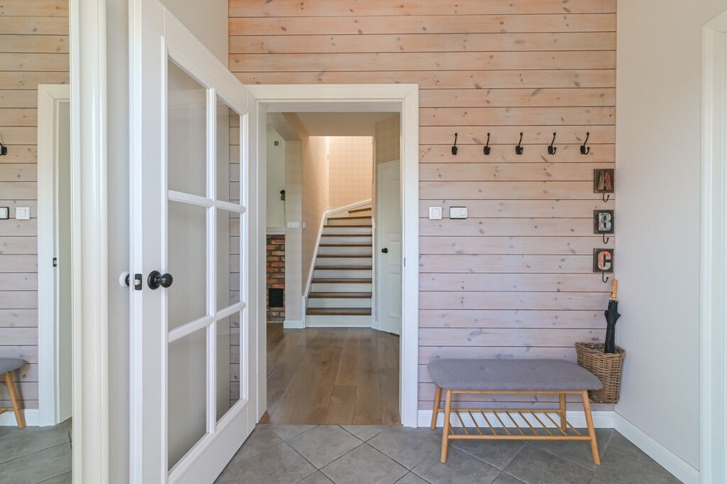Nie sposób oprzeć się klimatowi tego domu. Przyjemne barwy drewnianej podłogi oraz schodów i podsufitowych desek, w połączeniu z kolorami i wzorami ścian, przywołują na myśl ducha angielskich, gustownych wnętrz.