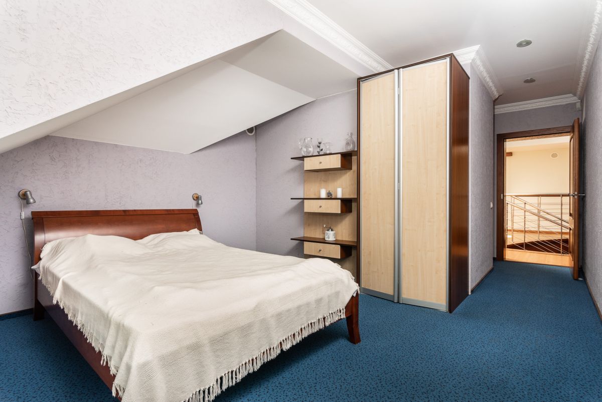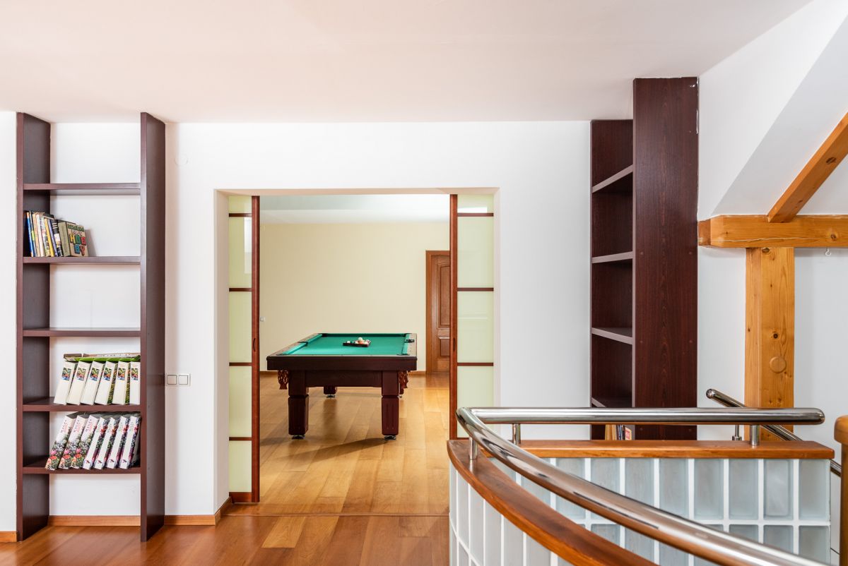 Na poddasze prowadzą drewniane schody zarówno z salonu jak i przedpokoju. Nad pokojem dziennym znajduje się antresola ze stołem bilardowym oraz biblioteką.