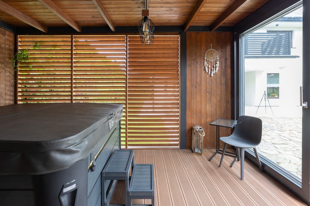 W ogrodzie znajduje się domek o powierzchni około 25 m², pełniący funkcję strefy relaksu – wyposażony w suchą saunę fińską, saunę infrared, tężnię solankową oraz jacuzzi.
