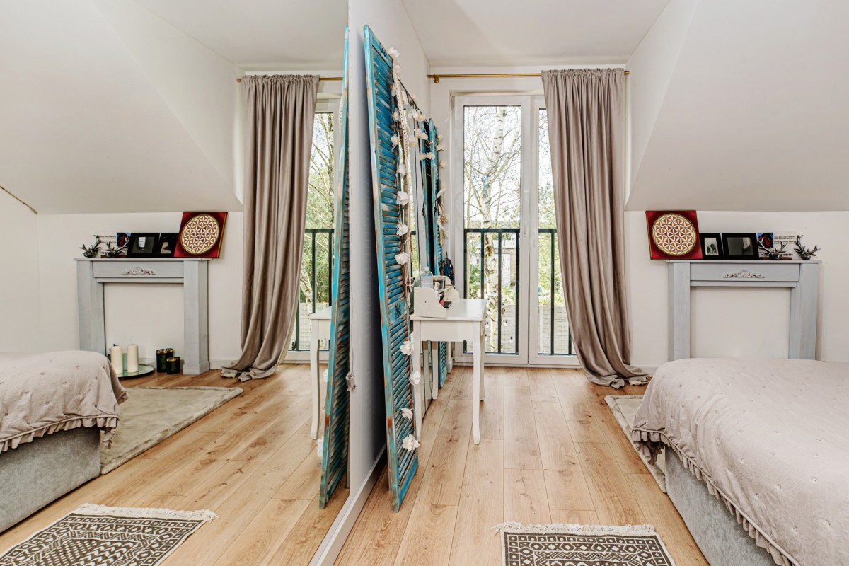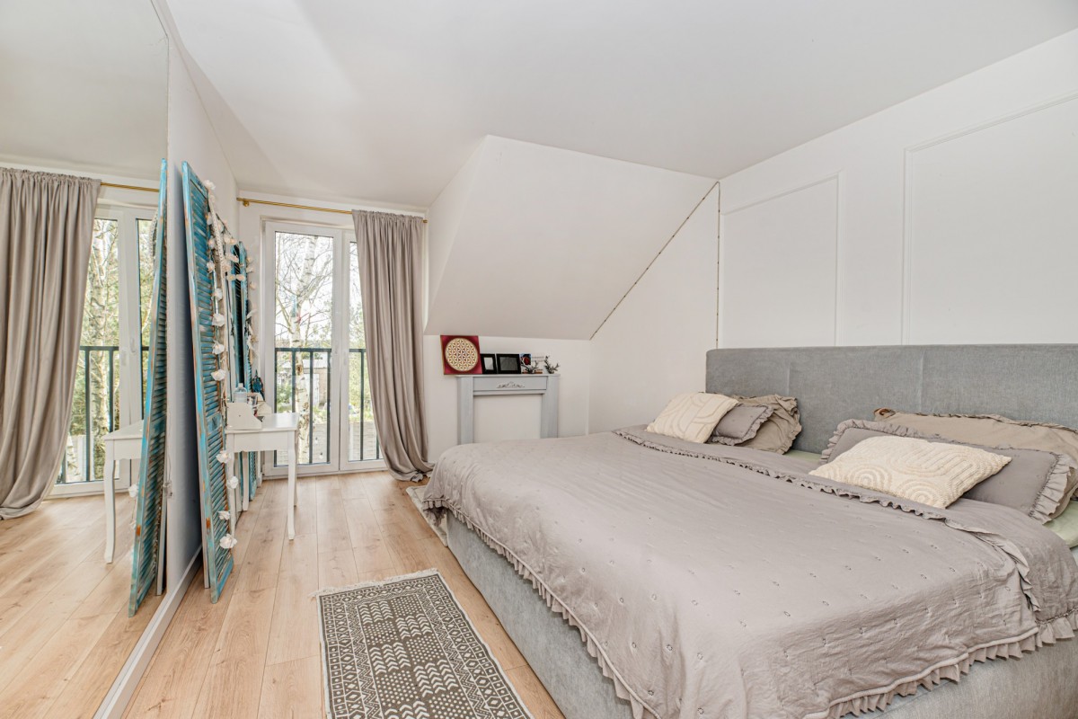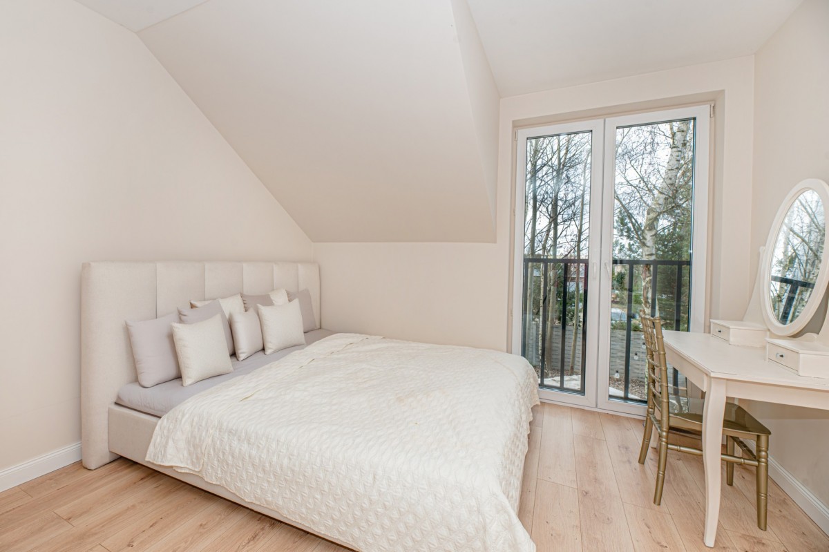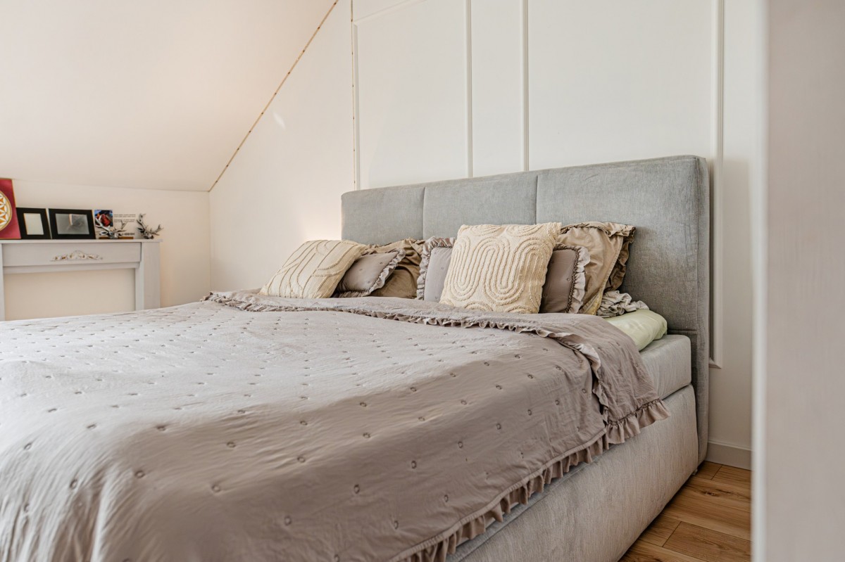 Na piętrze znajdują się trzy duże, jasne sypialnie, zaprojektowane z myślą o wygodzie i estetyce.