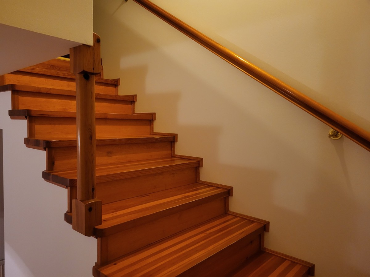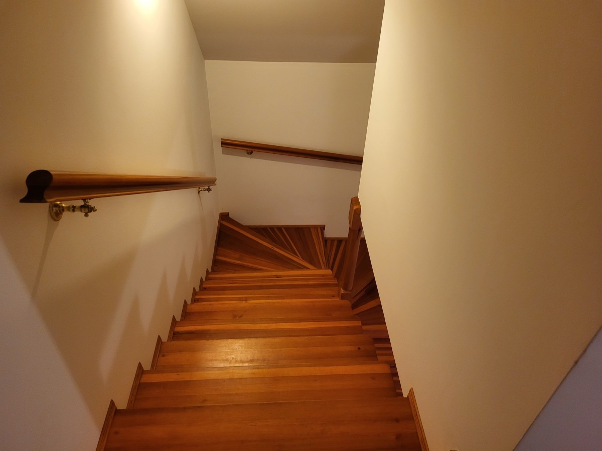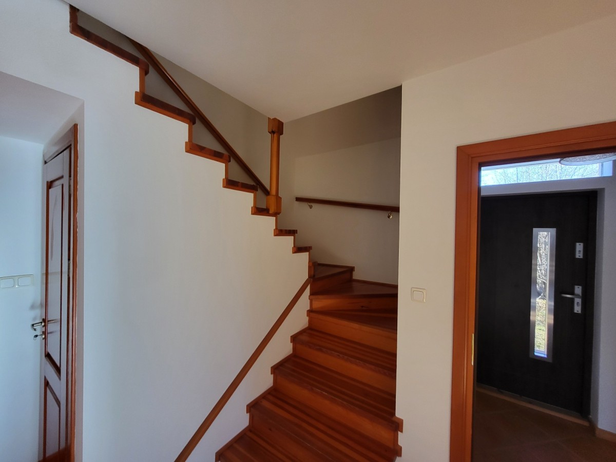 Drzwi i schody wykonane z drewna sosnowego nadają wnętrzu ciepła i naturalnego charakteru.