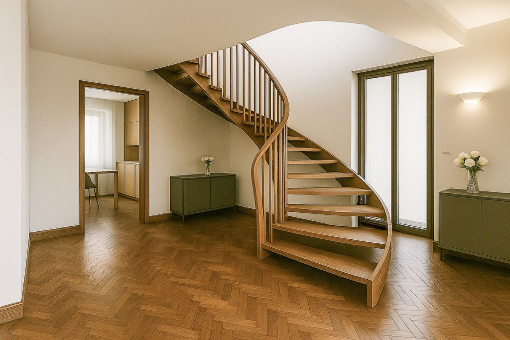 - Schody z drewna bukowego, wykonane według indywidualnego projektu, gięte.