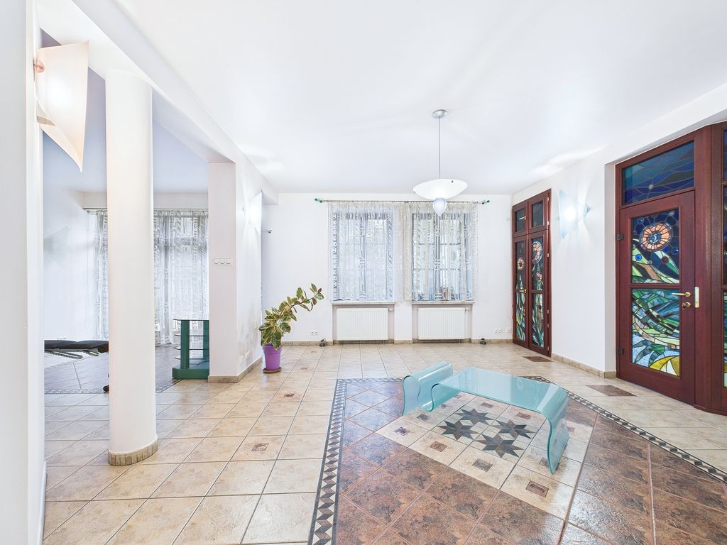 - Witraże ozdobne na parterze zdobiące drzwi oraz ściany.