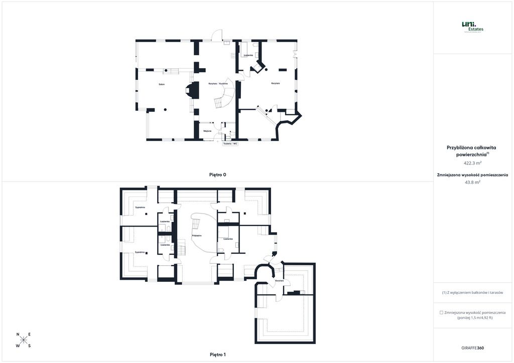 1 Piętro: - przestronny hol prowadzący do 4 sypialni - każda z łazienką i garderobą,