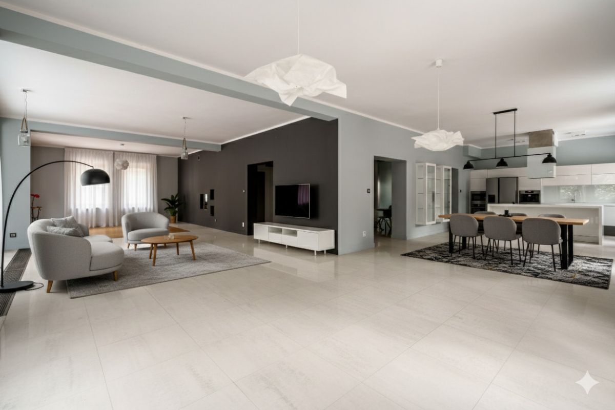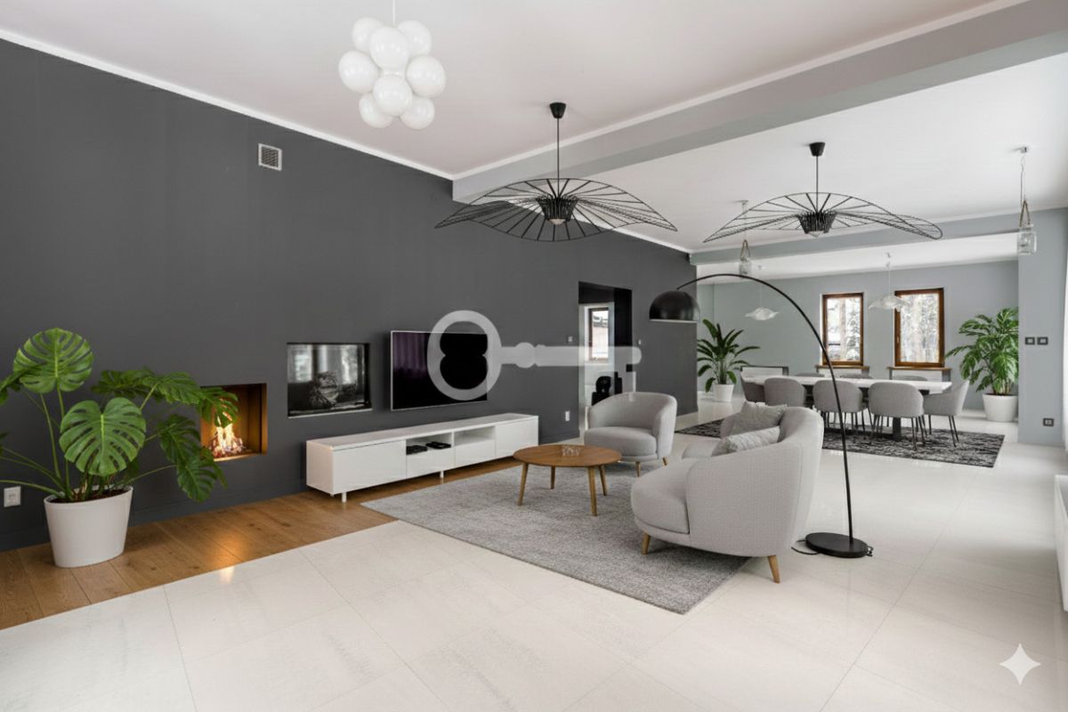 Ten przestronny dom na działce 2594 m² to idealne miejsce do życia i pracy. Duża powierzchnia podzielona na piwnice, parter, 1 piętro, gdzie łącznie znajduje się 9 pokoi oraz pomieszczenia gospodarcze. Wykończony z najwyższej jakości materiałów - drewna, marmuru i stylowych płytek - łączy luksus z funkcjonalnością. Wysokie wnętrza, kominek i przemyślany układ zapewniają komfort oraz prestiż.
