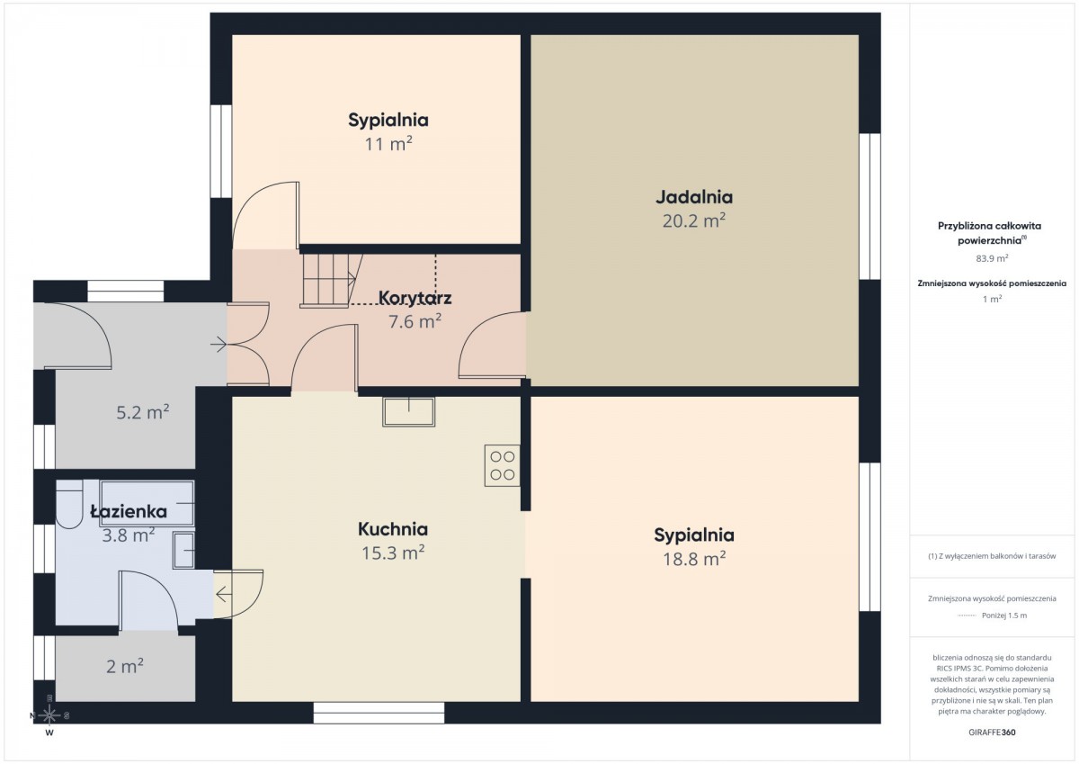 Całość o powierzchni około 100 m2 na działce o powierzchni 1066m2.