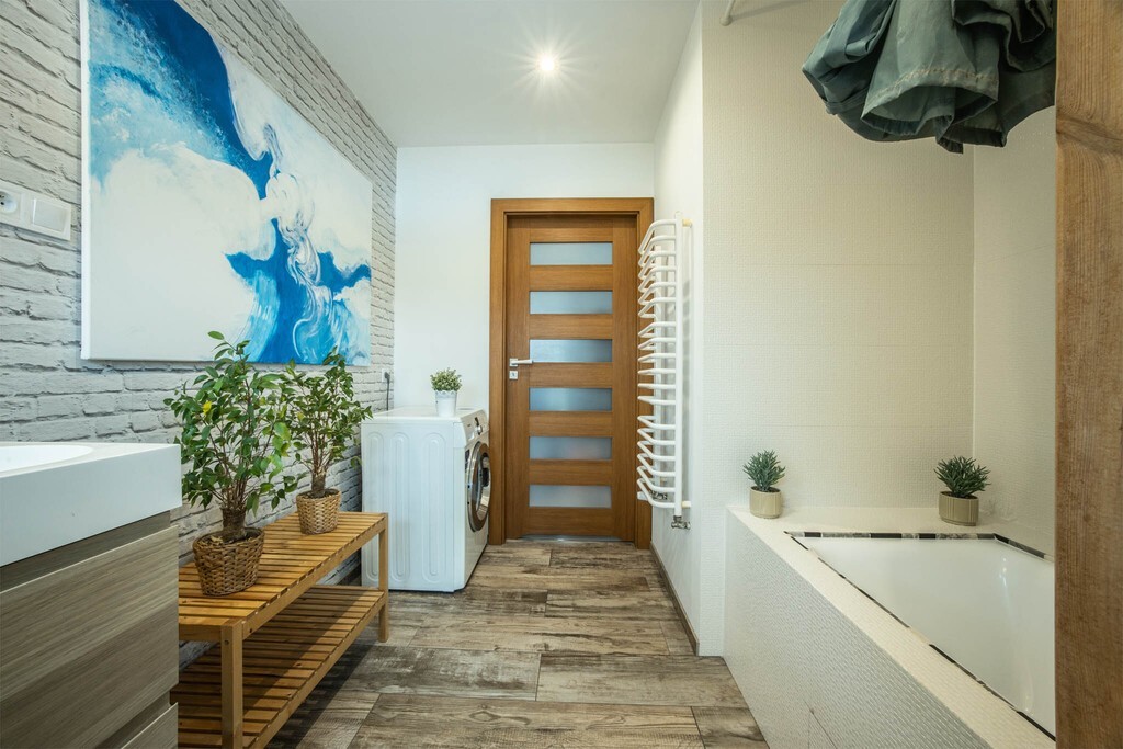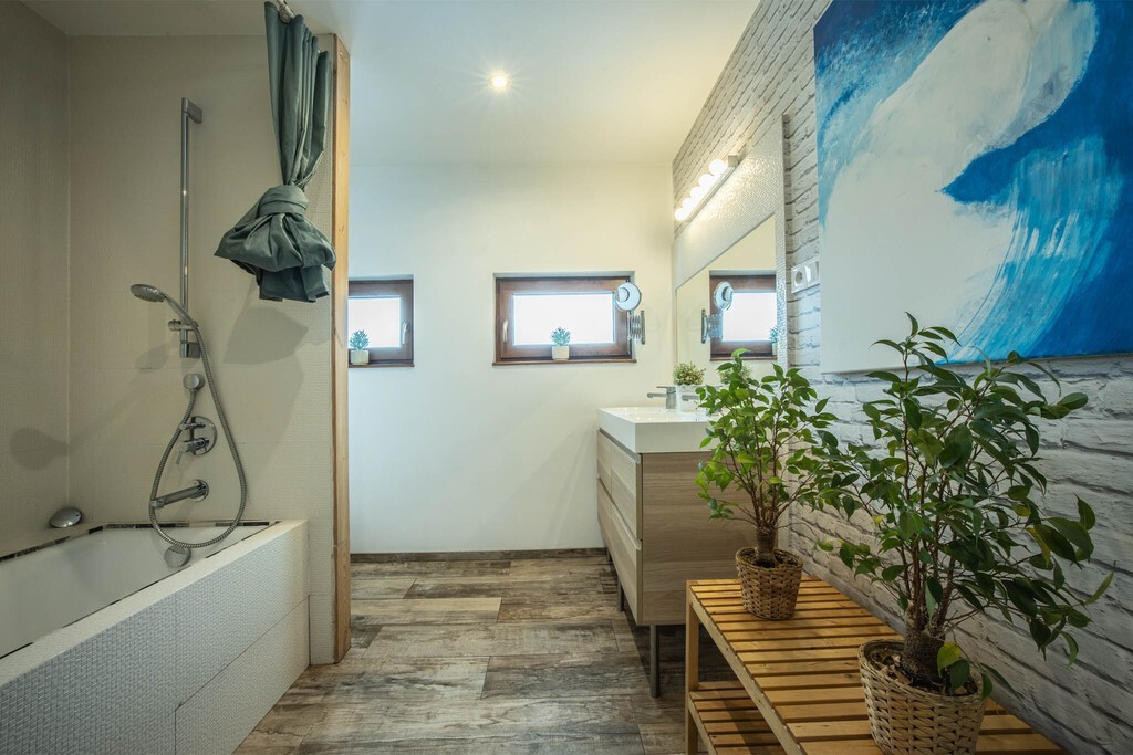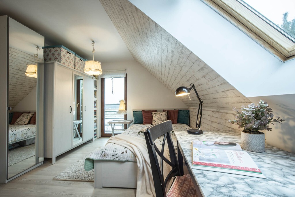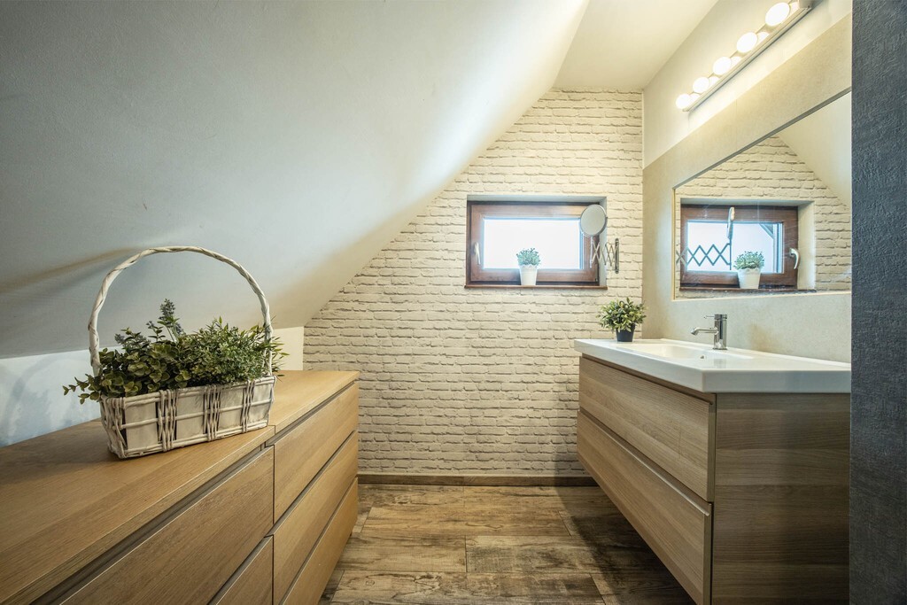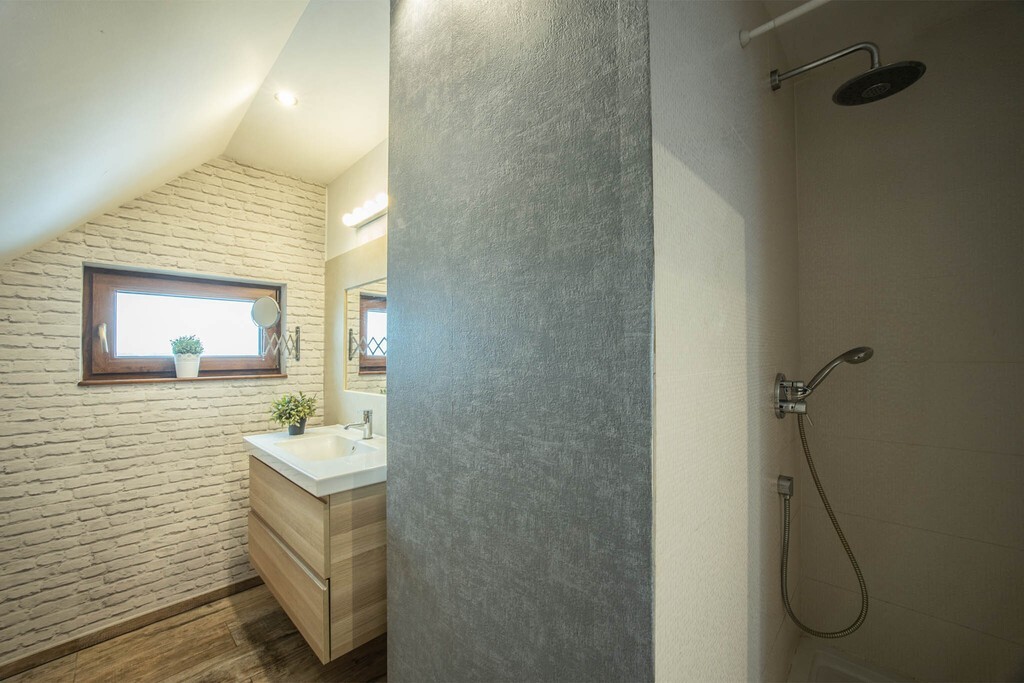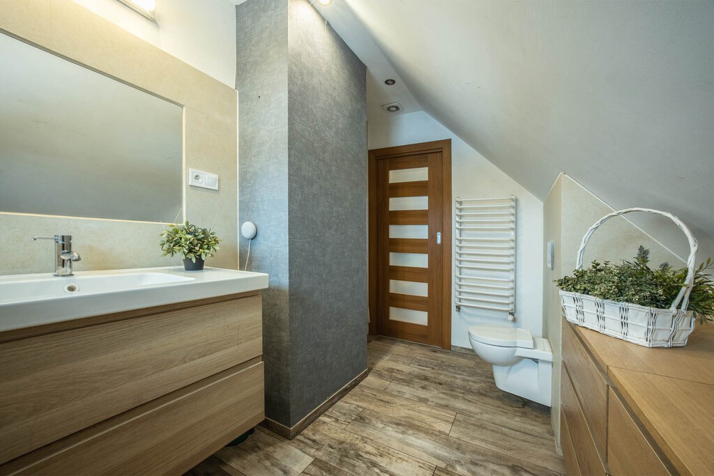 własną, prywatną łazienkę, co zapewnia maksymalny komfort. Na piętrze znajduje się również druga, ogólnodostępna łazienka.