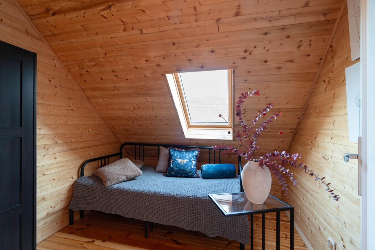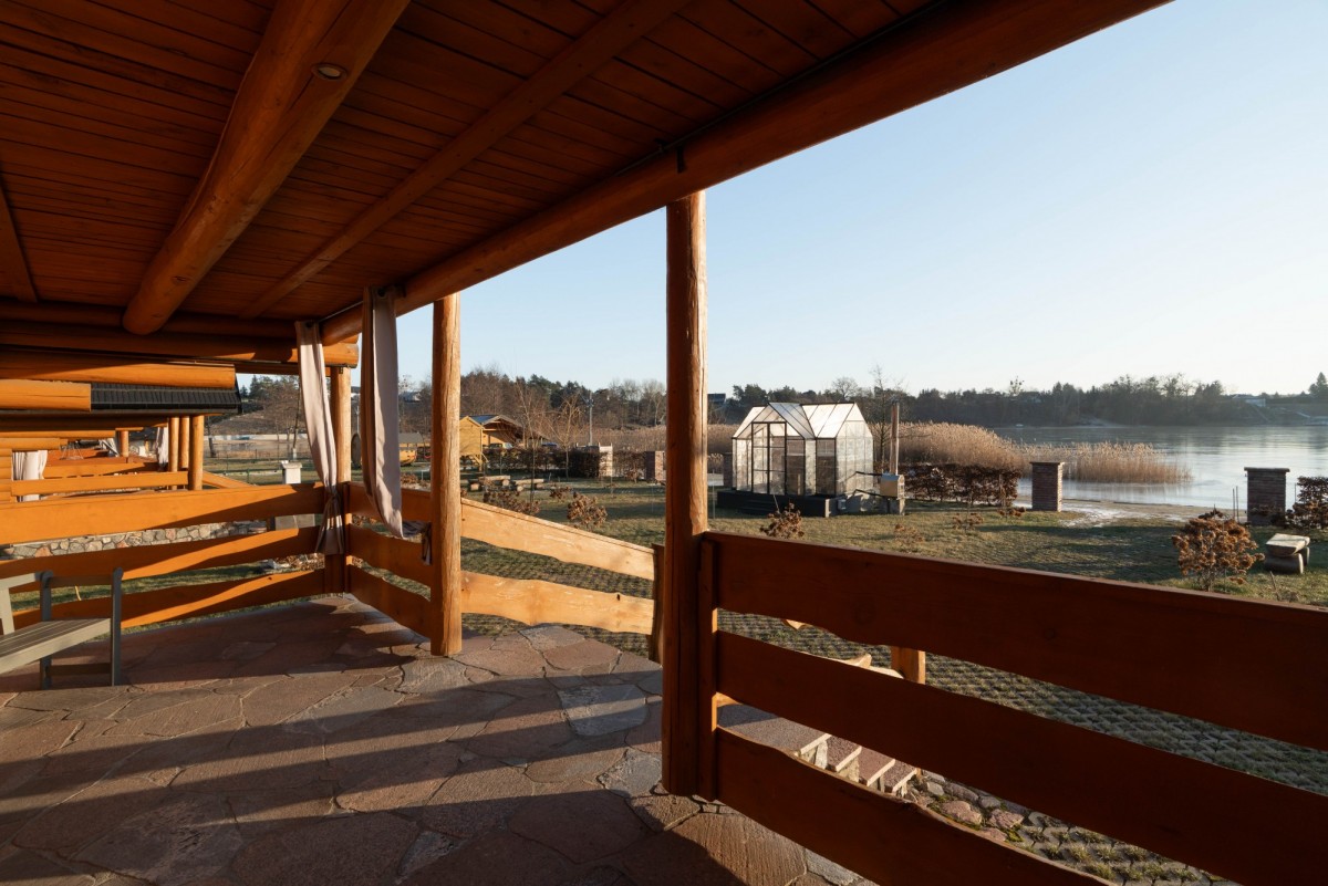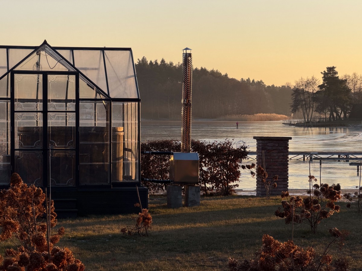 Na działce znajduje się prywatna bania do kąpieli, która doskonale sprawdza się jako strefa relaksu po dniu spędzonym na wodzie lub wieczorami, niezależnie od pory roku.