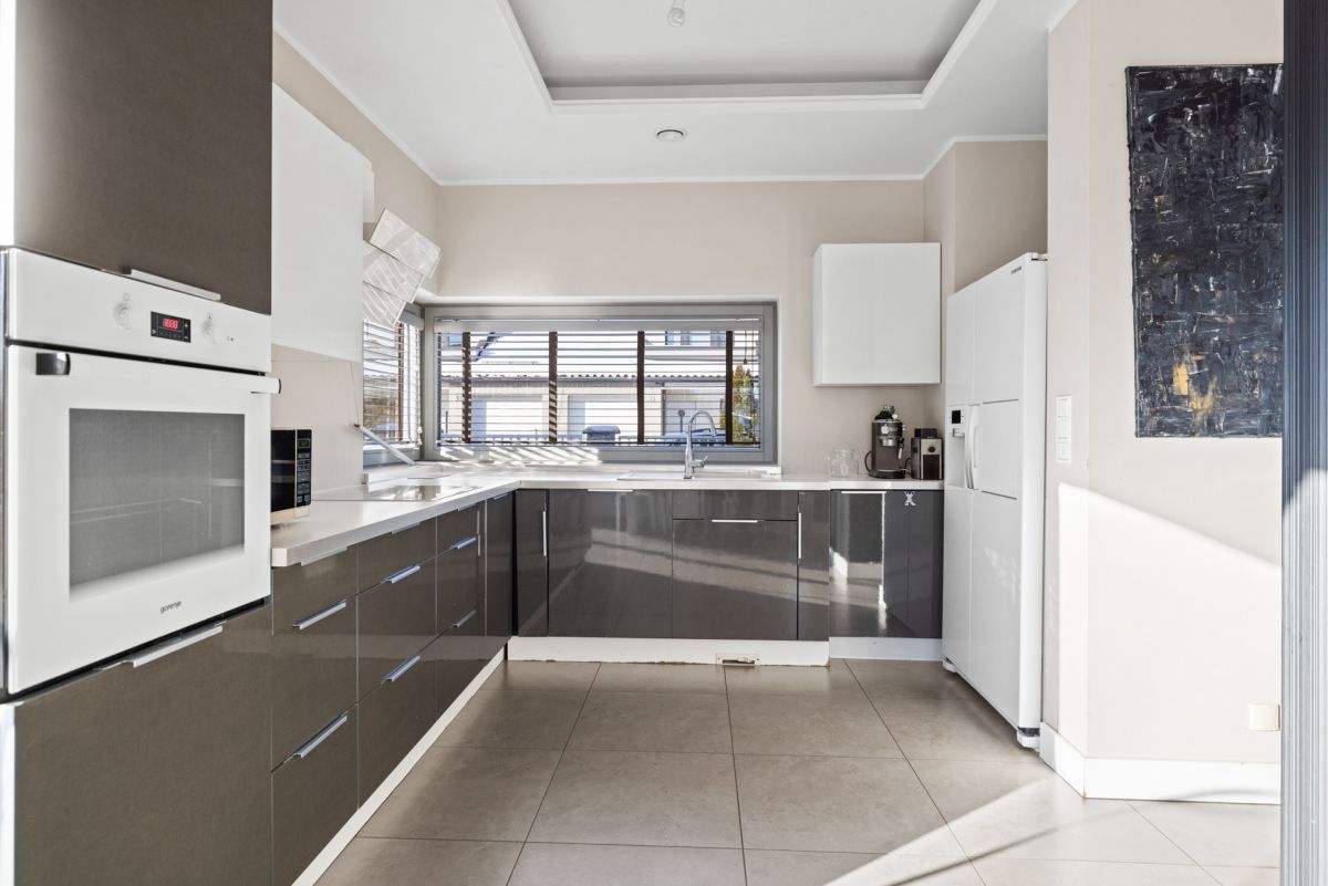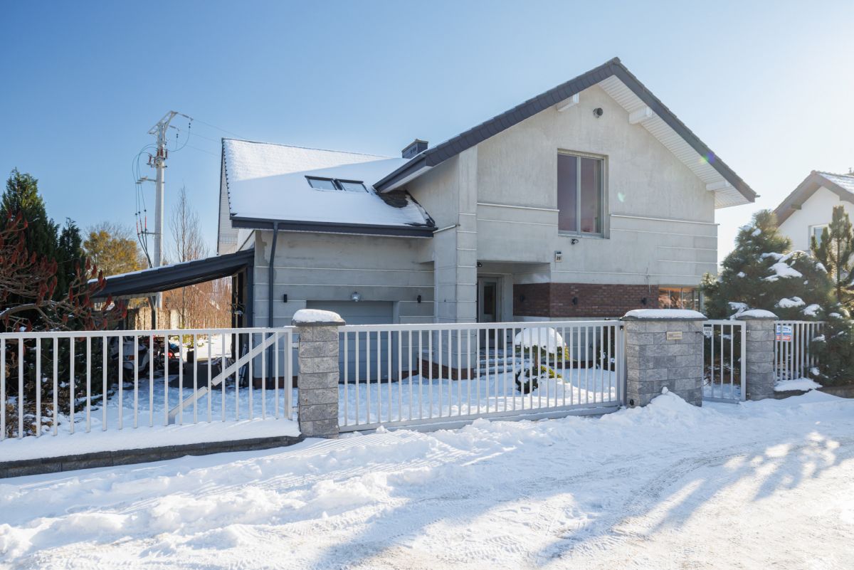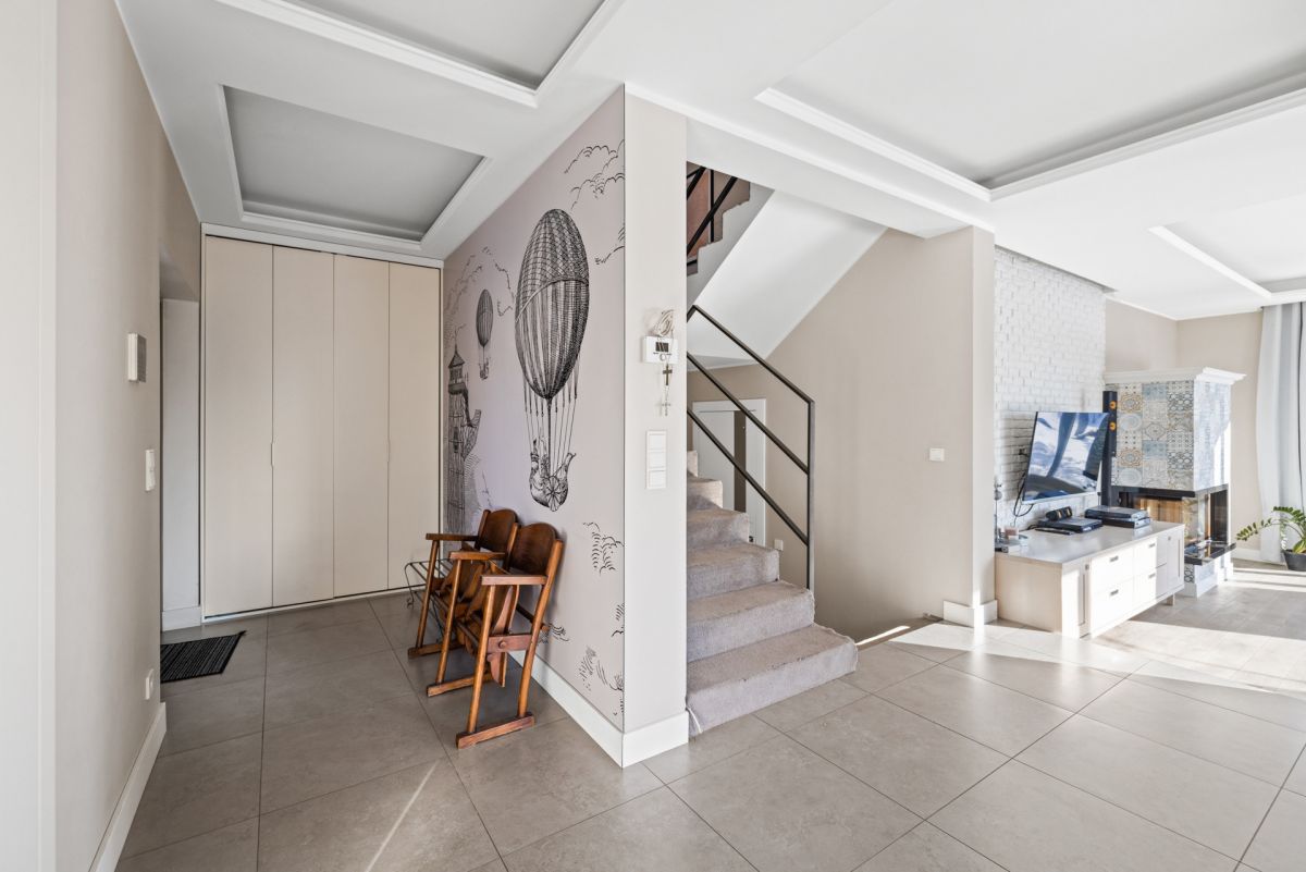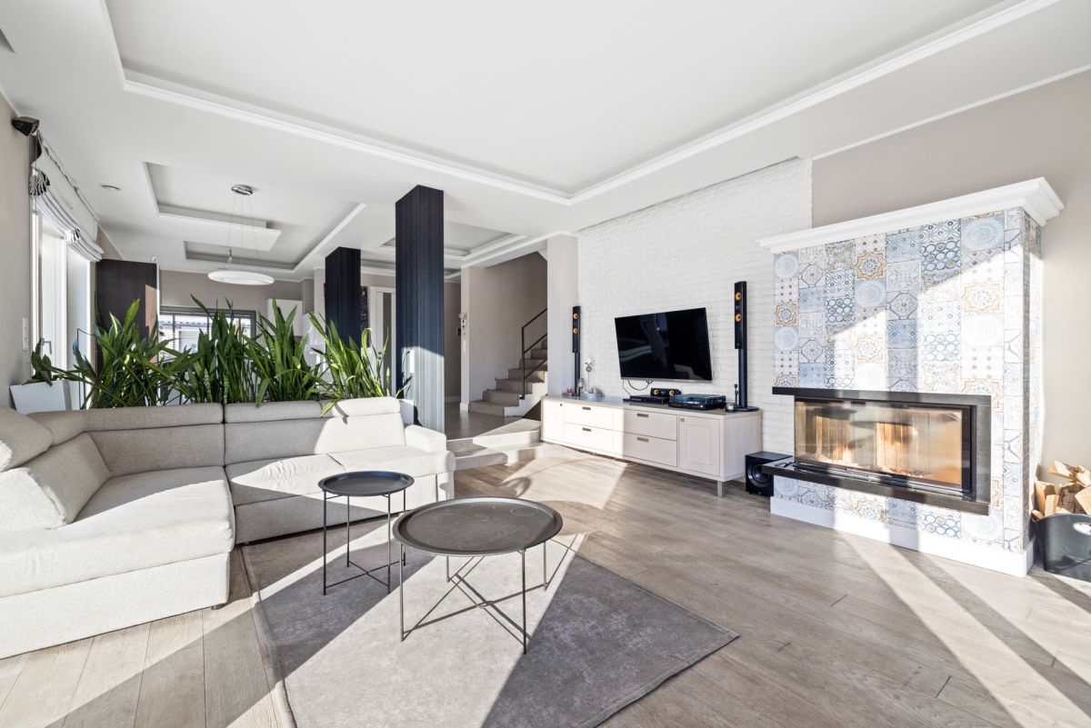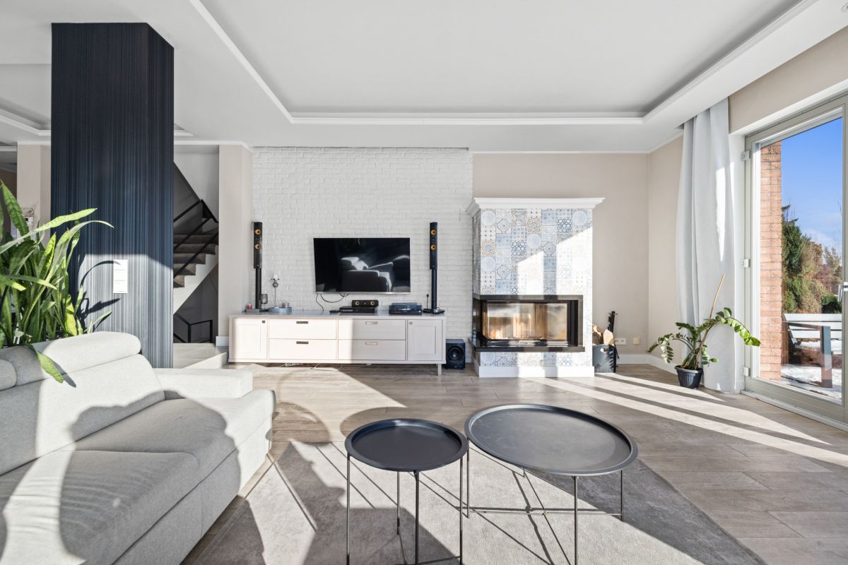 Dom oferuje około 280 m² powierzchni użytkowej, w tym 5 pokoi, wygodną strefę dzienną oraz pełne zaplecze gospodarcze. Przestronny salon z kominkiem płynnie łączy się z jadalnią i dużymi przeszkleniami wychodzącymi na taras oraz ogród z widokiem na staw - to serce domu, idealne do codziennego życia i przyjmowania gości.