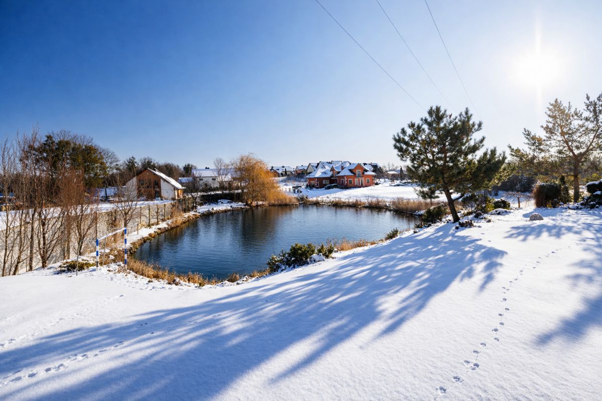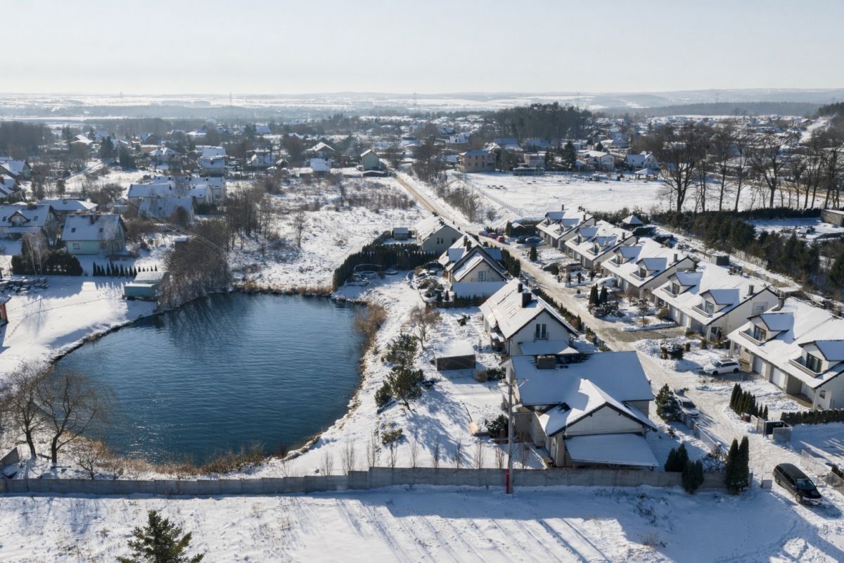 Działka o powierzchni 2500 m² została starannie zaaranżowana - rozległy zadbany trawnik, nasadzenia ozdobne oraz kształtowane strefy ogrodu tworzą spójną całość. Największym atutem jest prywatny dostęp do linii brzegowej stawu wraz z prywatnym pomostem oraz bezpośredni widok na wodę z tarasu, części dziennej i sypialni master. Salon to idealne miejsce na wypoczynek, poranną kawę, spotkania z bliskimi czy spokojną pracę z domu.
