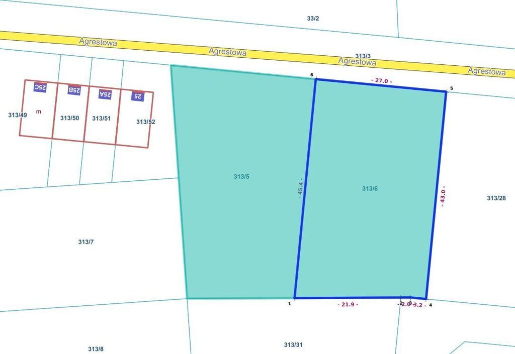 (nr 313/5) o powierzchni 1215 m². Łączna powierzchnia obu działek to ponad