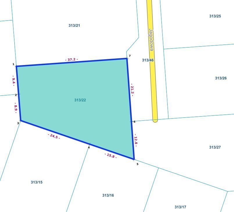 - Dojazd: Droga gminna utwardzona (ul. Wiśniowa) oraz droga wewnętrzna nieutwardzona (ul. Jagodowa). Kupując działkę, nabywasz również udział w drodze wewnętrznej (nr 313/46).