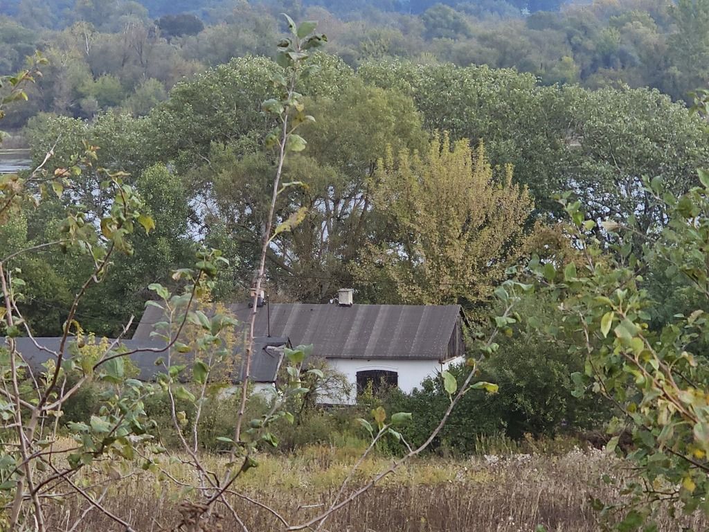 The plot is planted with fruit trees and shrubs. The terrain is largely flat, situated on a high slope approximately 130 meters from the Vistula River.