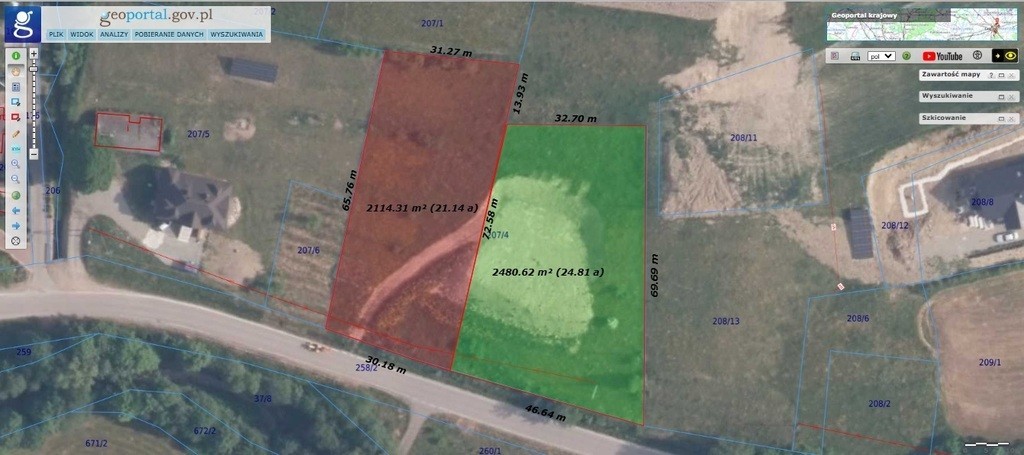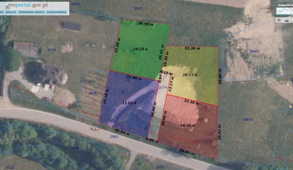 Niniejsza oferta dotyczy przestronnej działki budowlanej o powierzchni 4600 m2, położonej w miejscowości Młyńczyska w powiecie limanowskim. Działka graniczy bezpośrednio z gminną drogą asfaltową, ma wymiary ok 70x72 m i kształtem zbliżona jest do kwadratu. Teren został już przystosowany do posadowienia domu jednorodzinnego, a właściciel dopuszcza sprzedaż mniejszych działek po ich wydzieleniu z całości. Na zdjęciach znajduje się kilka propozycji podziału. Nowo wydzielone działki nie mogą być mniejsze niż 6 arów. Na działce znajduje się słup elektryczny, a wzdłuż drogi położona jest sieć wodociągowa.