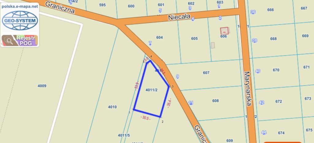 Media: Prąd dostępny bezpośrednio na działce, woda – dostępna w ul. Granicznej, gaz w odległości 50m od działki (skrzyżowanie ul. Graniczna i Niecała)
