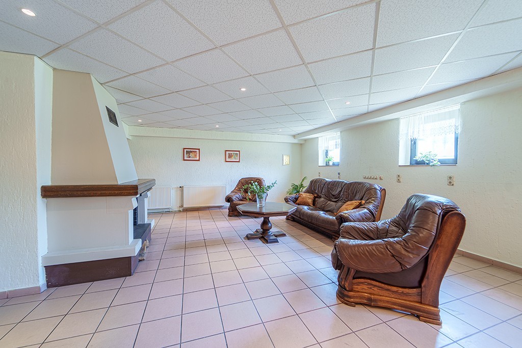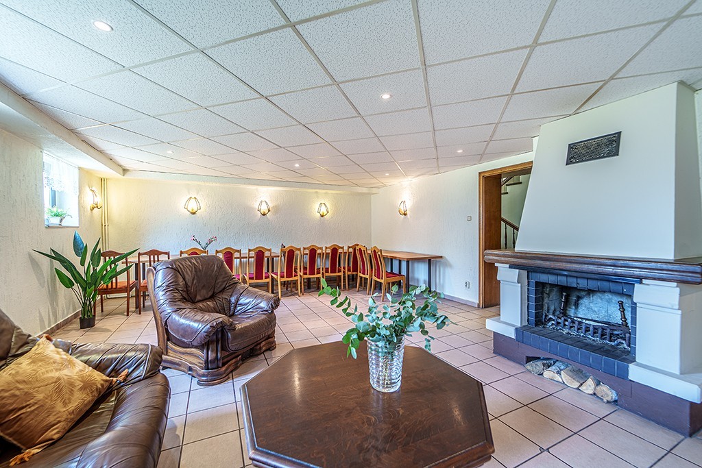 Budynek posiada także dolną kondygnację, tzw poziom 0, z przestronnym pokojem kominkowym z wygodnymi fotelami. Pomieszczenie może również pełnić rolę salki konferencyjnej. Na tej kondygnacji mieszczą się również pomieszczanie gospodarcze (7 szt) z możliwością adaptacji na kolejne pokoje oraz kotłownia z piecem na ekogroszek.