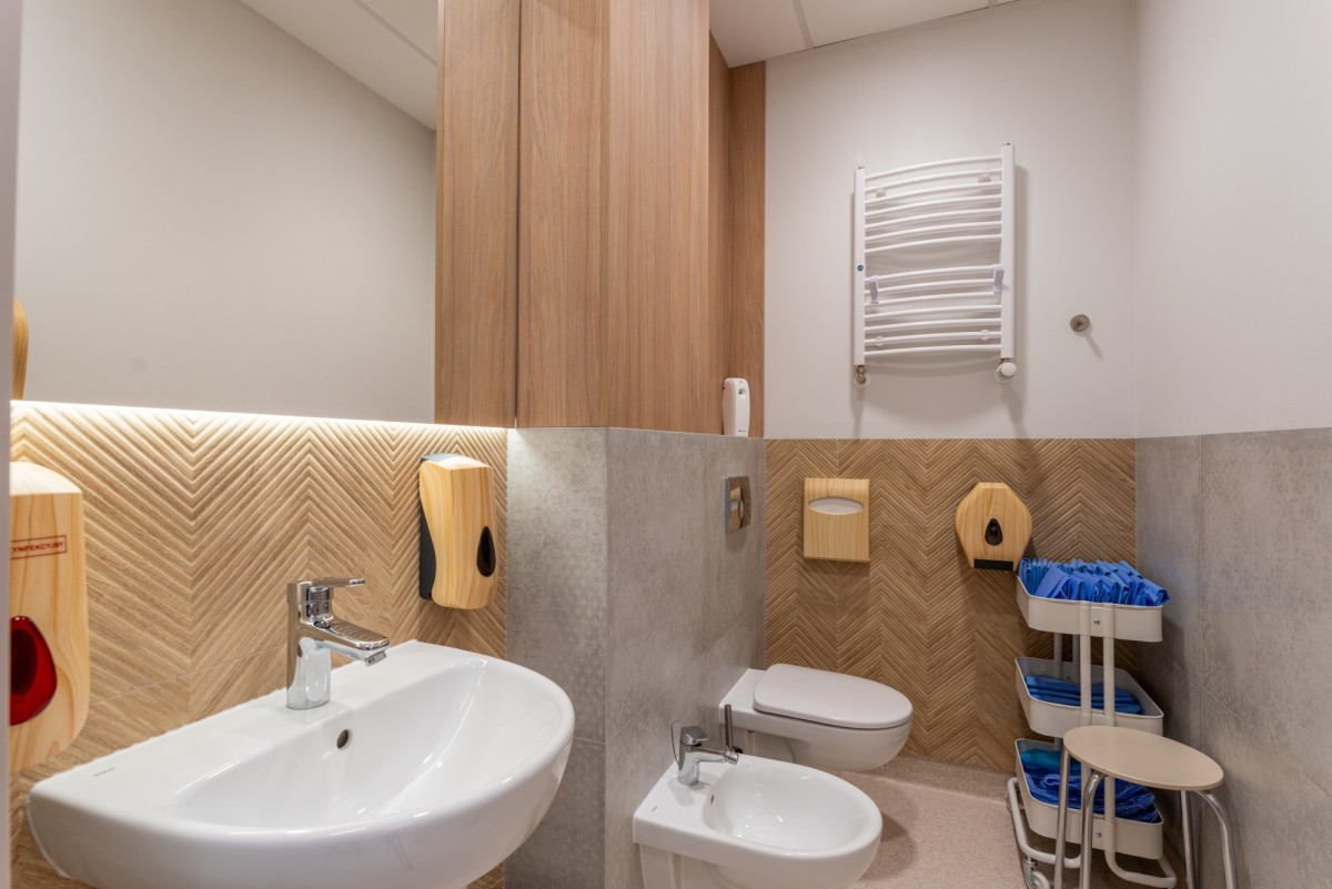 Harmonijne połączenie luksusu z funkcjonalnością medyczną sprawia, że lokal ten idealnie wpisuje się w potrzeby wymagającej branży. Bardzo dobry stan techniczny i wizualny, estetyka detali i wysokiej klasy materiały (na podłogach gres oraz wykładzina linoleum, ściany: tynk strukturalny, tapety i lamele) w połączeniu z dużymi witrynami od strony północnej zapewniającymi naturalne światło tworzą przestrzeń kompletną, a wspólna klimatyzacja i wentylacja podnoszą komfort codziennej pracy. Nieruchomość sprzedawana jest wraz z trwałym wyposażeniem, bez sprzętu medycznego.