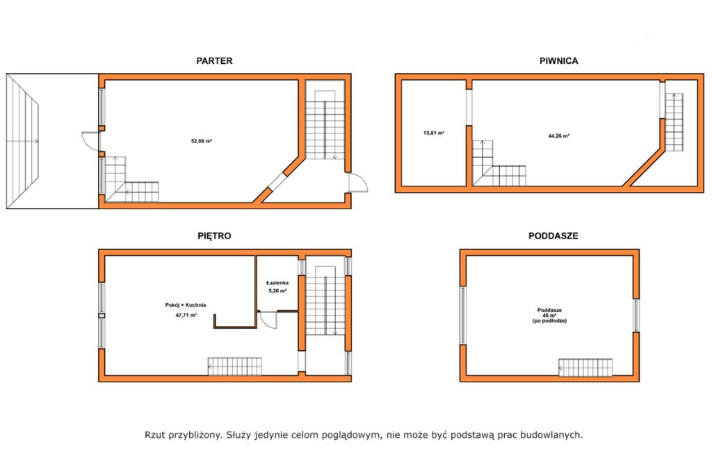 - parter - 54,50 m², piętro 50,32 m², poddasze - 16,00 m², piwnica- 86,00 m²