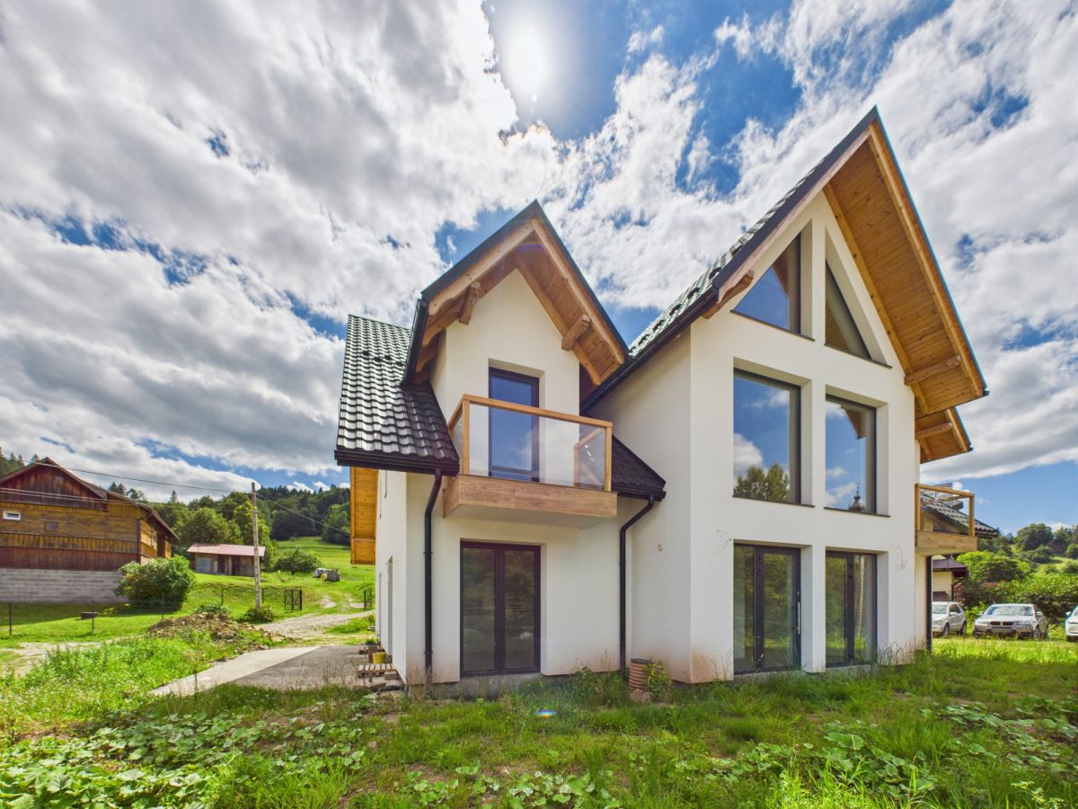 Nowoczesne materiały i technologie - m.in. pustak ceramiczny, ocieplenie styropianem 20 cm, potrójne szyby, stropy żelbetowe, pompa ciepła