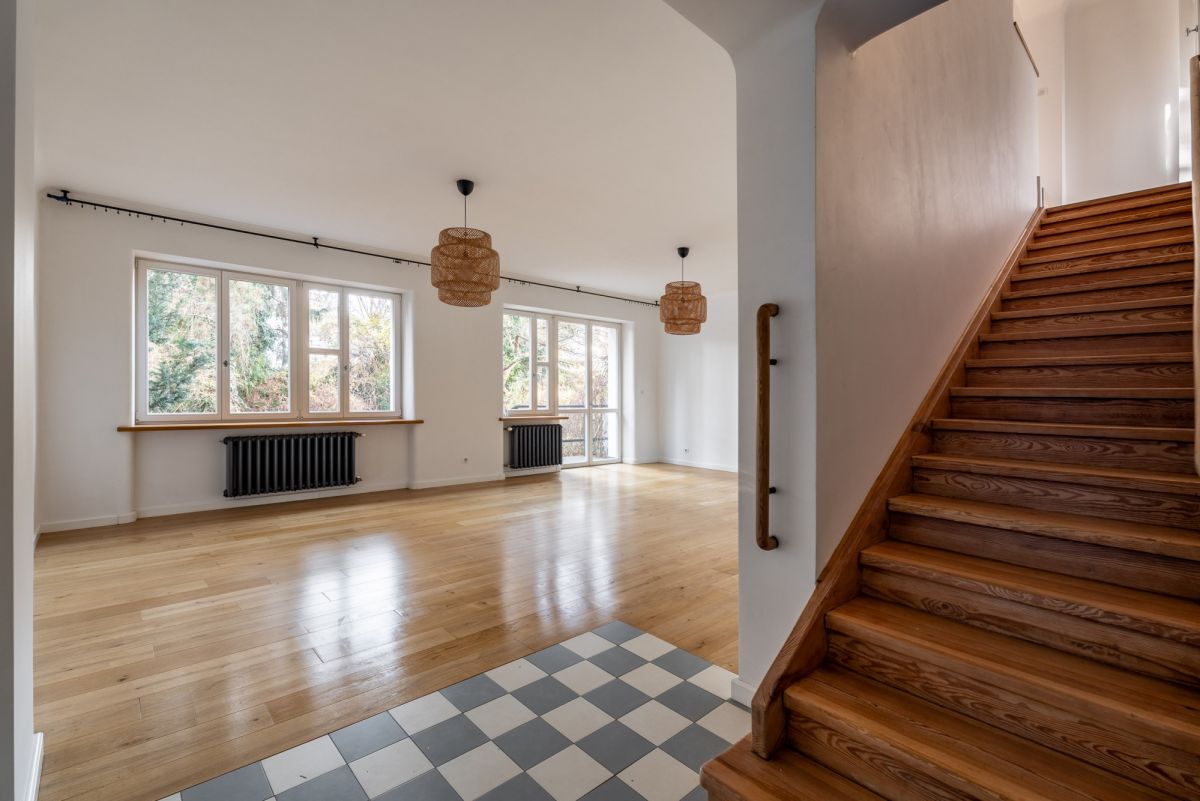 Dom z lat 30-tych po generalnym remoncie, podczas którego zachowano jego urok oraz pierwotny kształt. Drewniane podłogi, okna oraz drzwi nadają wnętrzom elegancji i charakteru. Przestronne, jasne pomieszczenia, zwłaszcza pokoje od strony południowej, zapewniają piękny widok na zielony, zadbany ogród.