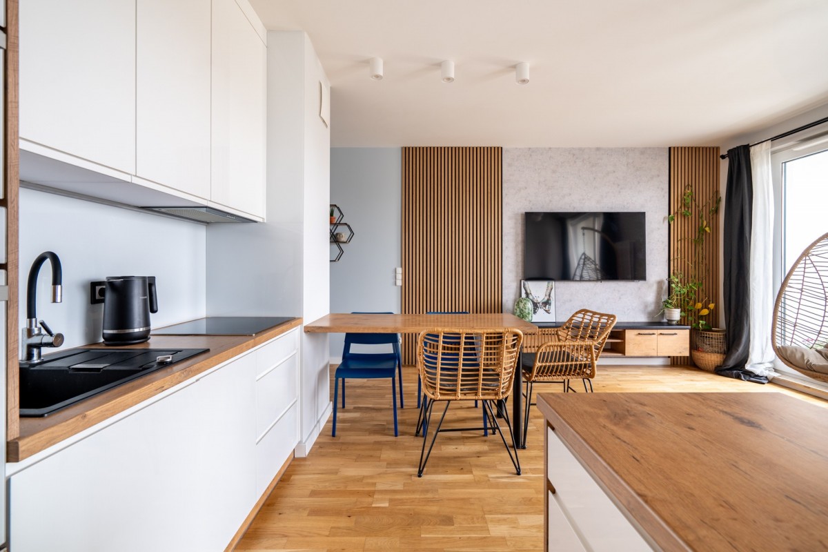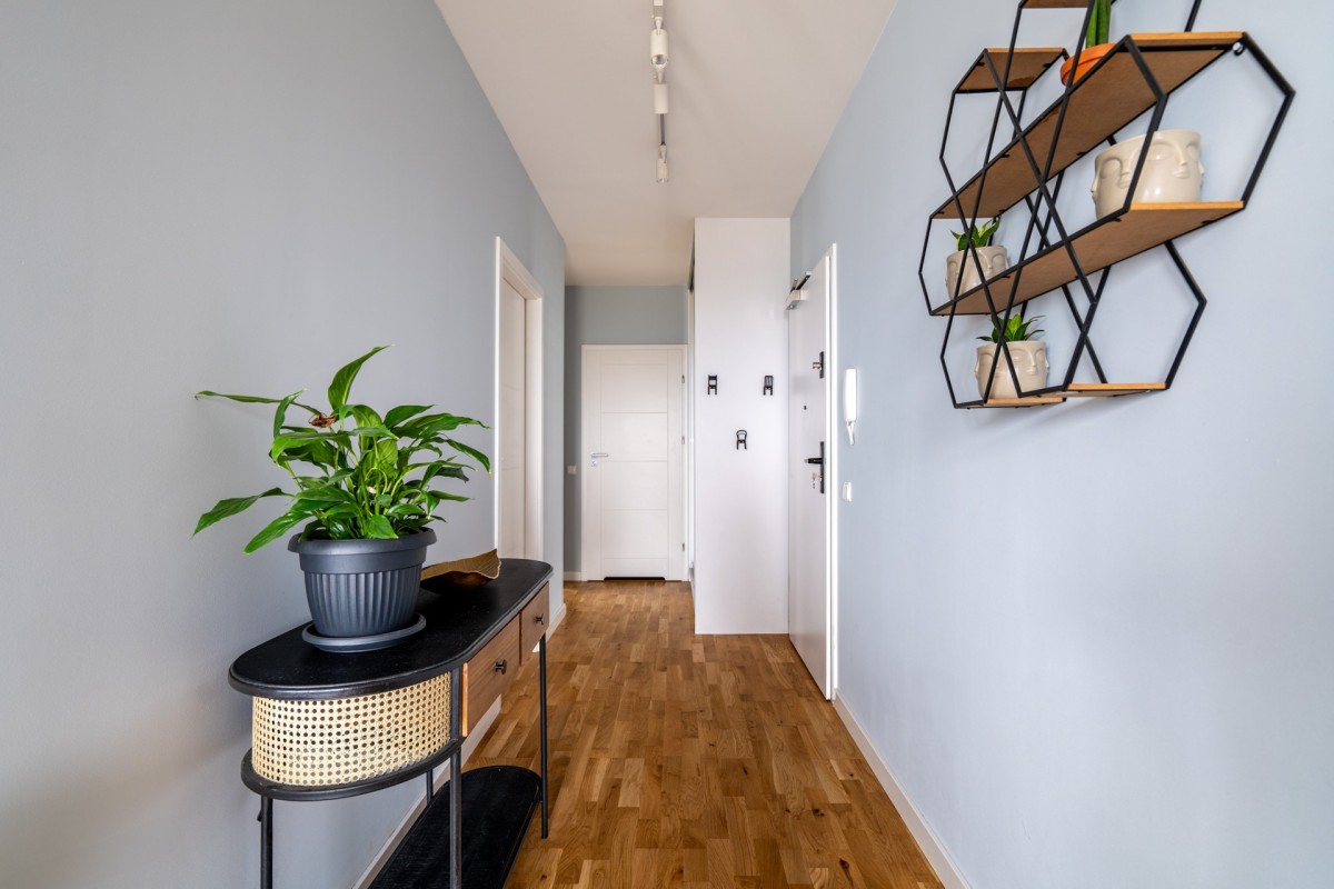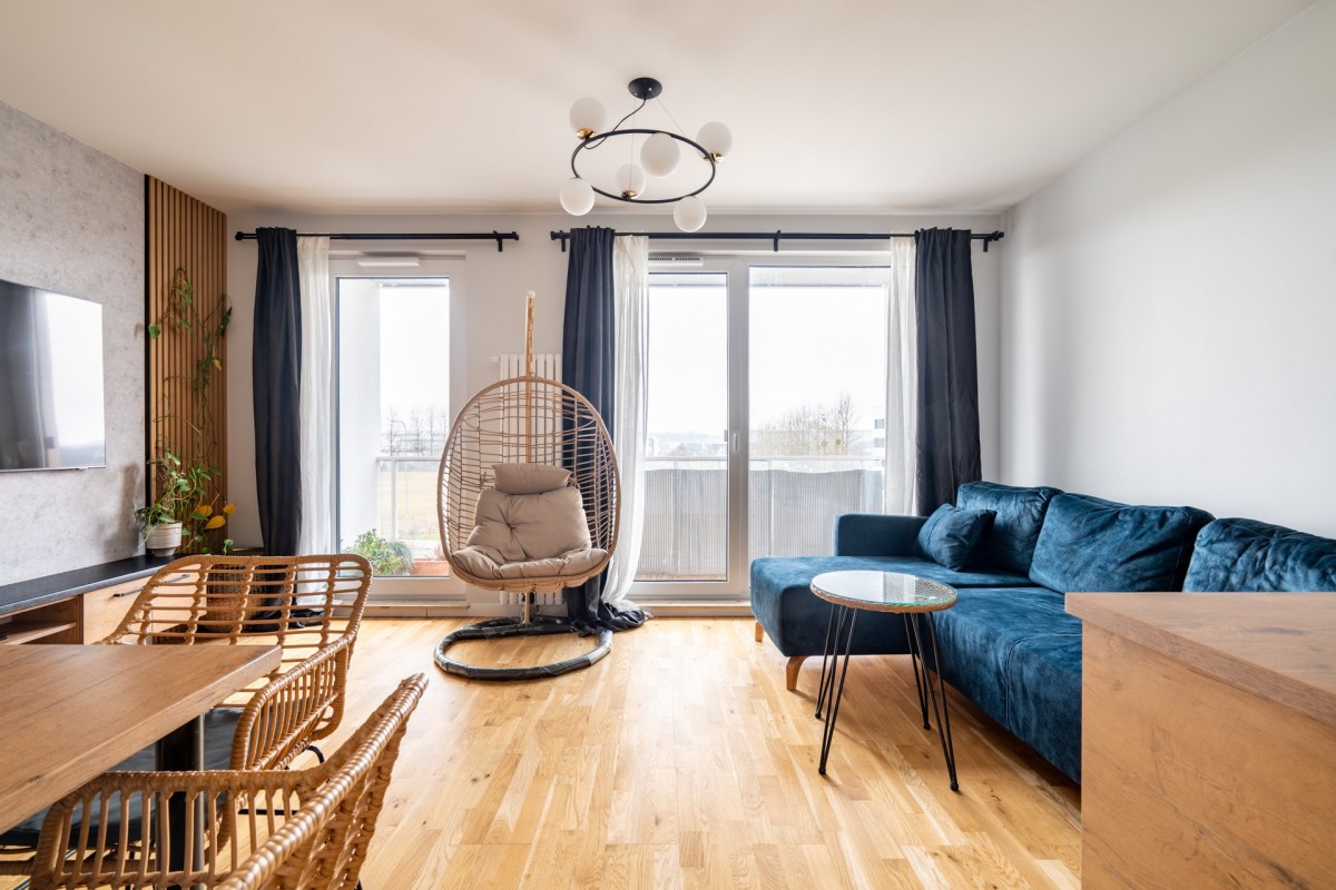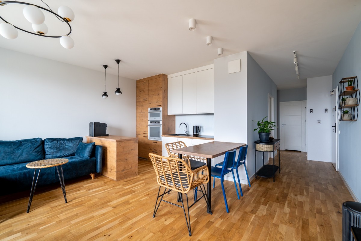 Mieszkanie wykończone jest w wysokim standardzie: w strefie dziennej i sypialniach zastosowano drewnianą deskę Barlinek, a kuchnię wykonano na wymiar - z lakierowanymi frontami, blatami laminowanymi i prowadnicami Blum. Zabudowa kuchni wyposażona jest w sprzęt AGD Whirlpool z technologią 6th Sense oraz lodówkę, zmywarkę i pralko-suszarkę LG. W salonie oraz sypialni znajdują się wykonane na wymiar zabudowy stolarskie, a w łazience zastosowano armaturę Grohe i Omnires oraz przestronną kabinę prysznicową. Mieszkanie jest spójne stylistycznie, utrzymane w jasnych barwach i naturalnych materiałach. Osiedle Start w dzielnicy Kokoszki oferuje nowoczesną zabudowę z halami garażowymi, windami i wygodnym dostępem do obwodnicy oraz lotniska.