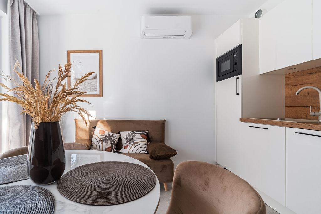 • W skład apartamentu wchodzi: część dzienna/sypialniana z aneksem kuchennym i wyjściem na taras oraz łazienka.