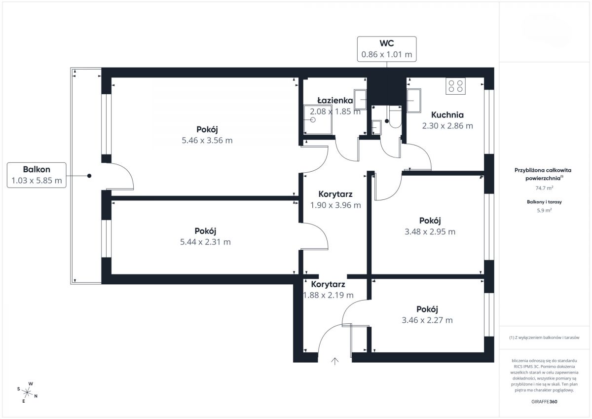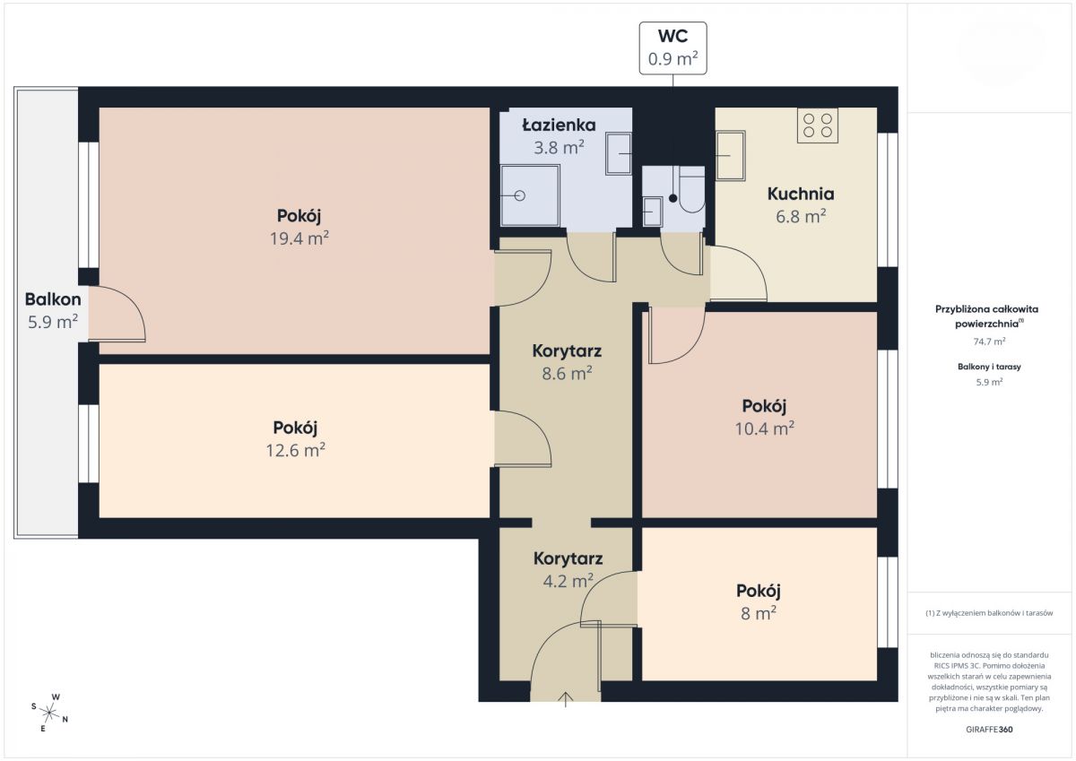 - Powierzchnia: 74,7 m² (dodatkowo duży balkon 5,9 m²).