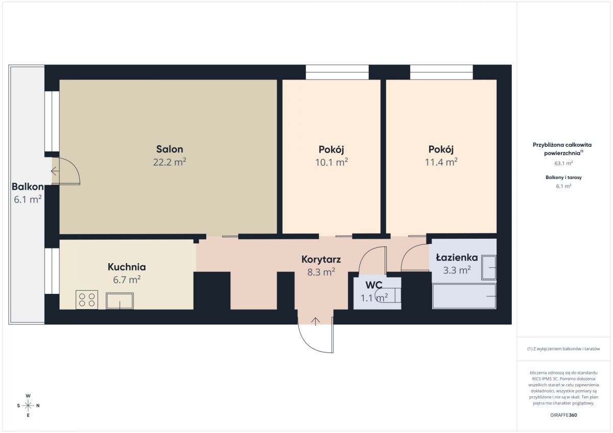 (Na zrzucie nie są dokładne wymiary 63 m2, mogą być nie wielkie odstąpienia od rzeczywistego metrażu który jest 61.14m2)