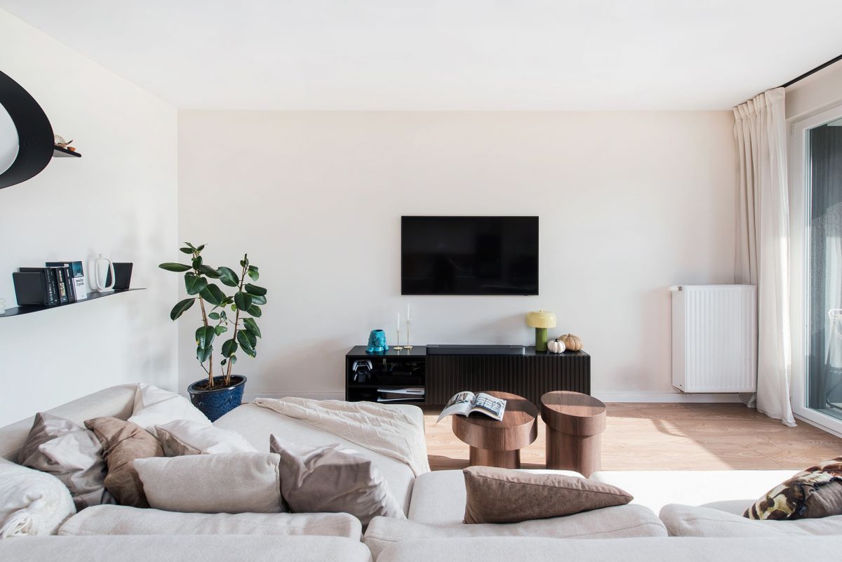Jasna, przestronna przestrzeń z dużymi przeszkleniami i wyjściem na loggię. Widok na zieleń gwarantuje prywatność i spokój. Aneks kuchenny wykonany na zamówienie przez stolarza, wyposażony w wysokiej klasy AGD: płytę indukcyjną, lodówkę, piekarnik, kuchenkę mikrofalową, okap, zmywarkę. W salonie wygodna sofa z funkcją spania, telewizor, stół z 4 krzesłami, meble RTV.