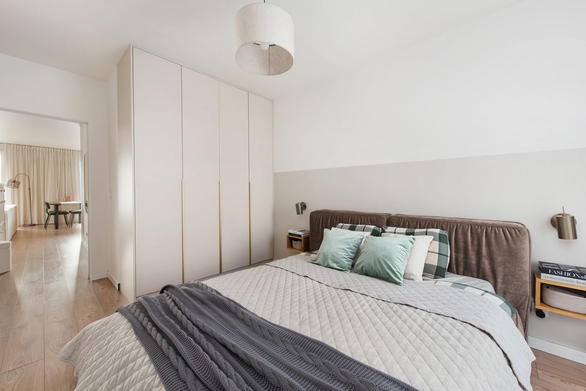 Z dużą szafą w zabudowie, pełnowymiarowym łóżkiem z materacem i dwiema szafkami nocnymi. Okna wychodzą na spokojną część osiedla.