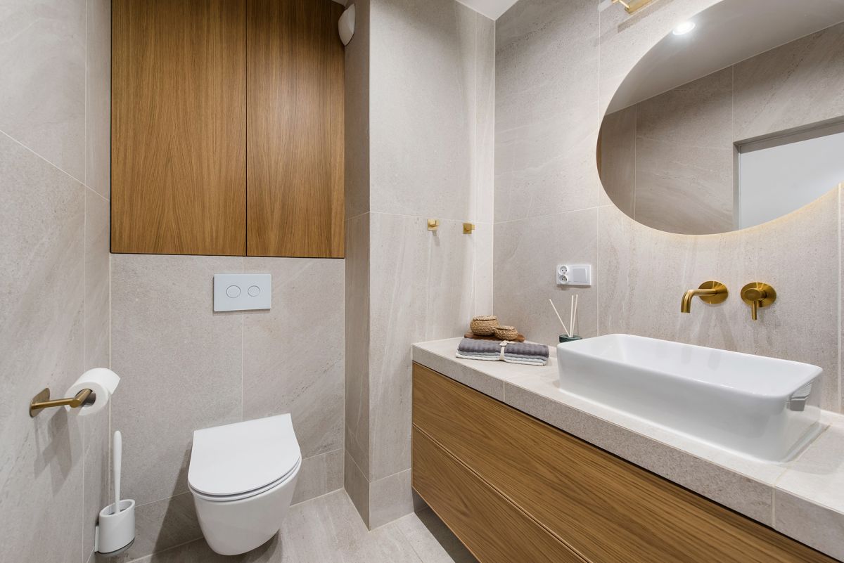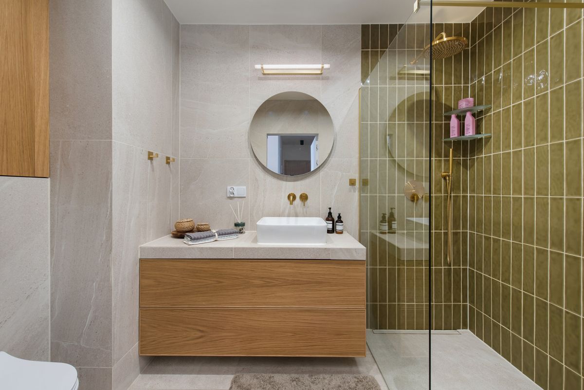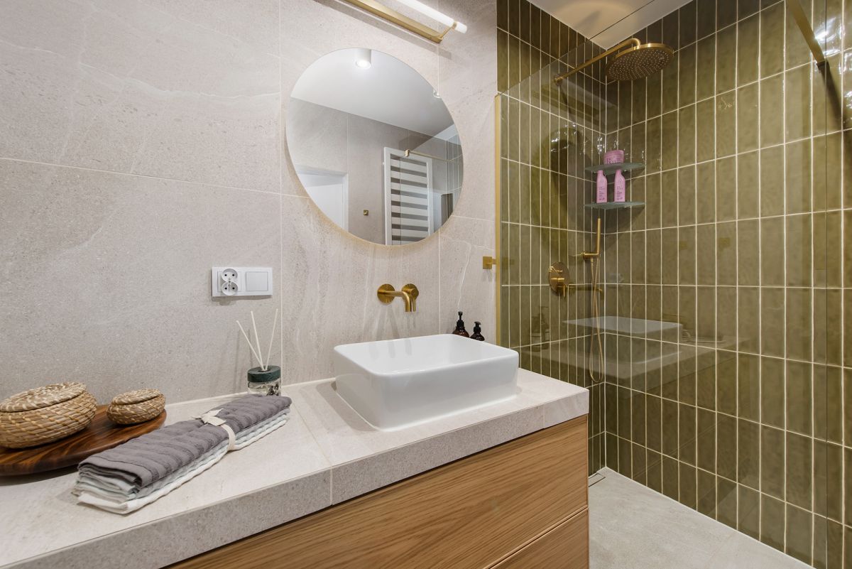 Elegancka, z prysznicem typu walk-in, odpływem liniowym i wysokiej klasy armaturą. Nowoczesne wykończenia i praktyczne szafki.
