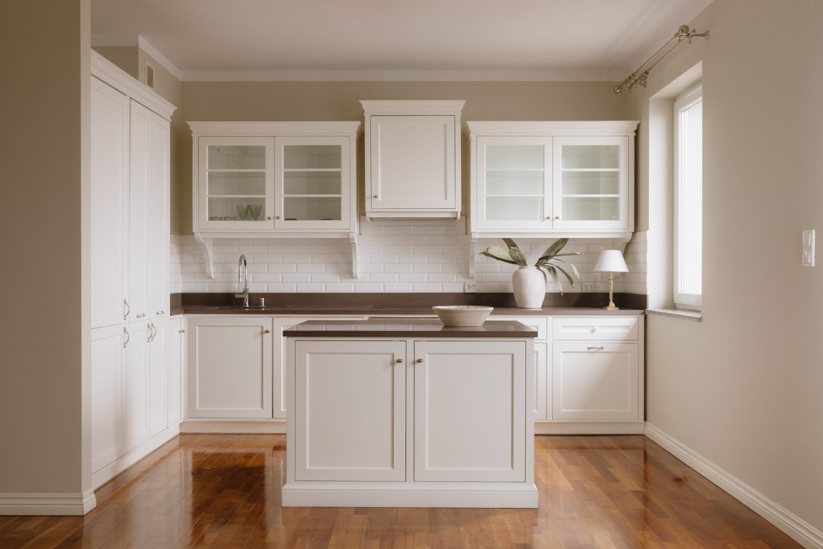 Wysokiej jakości zabudowa kuchenna, z funkcjonalną wyspą. Dużo miejsca do przechowywania.